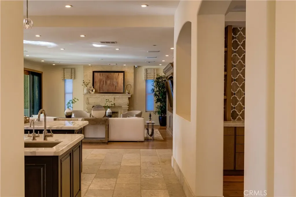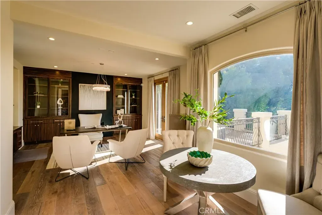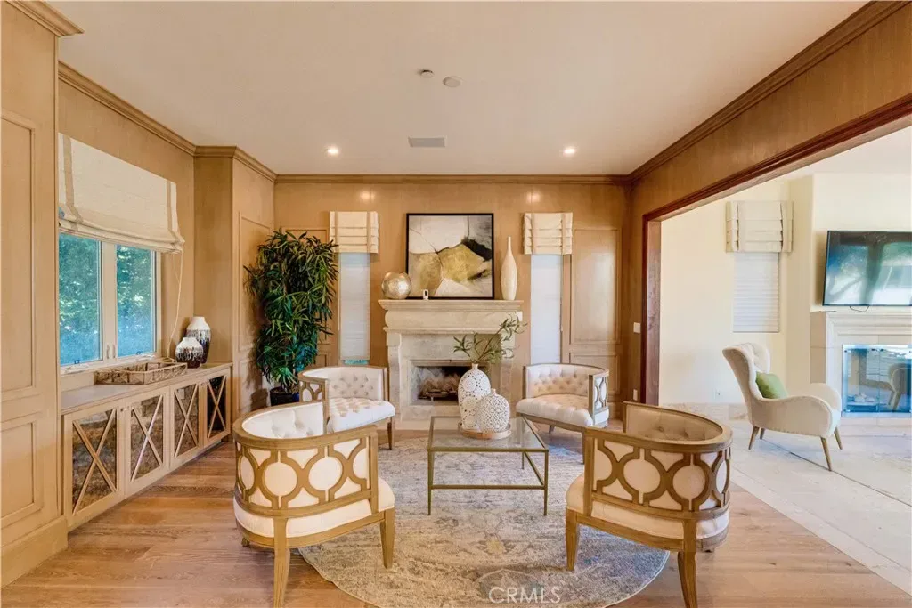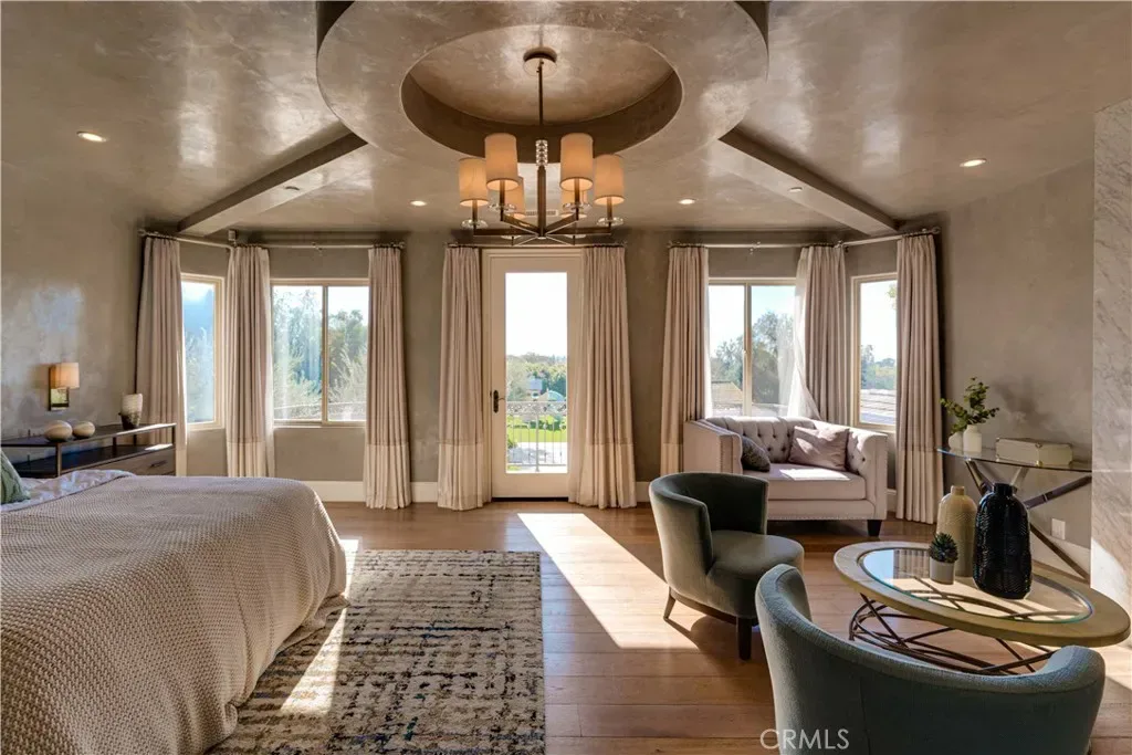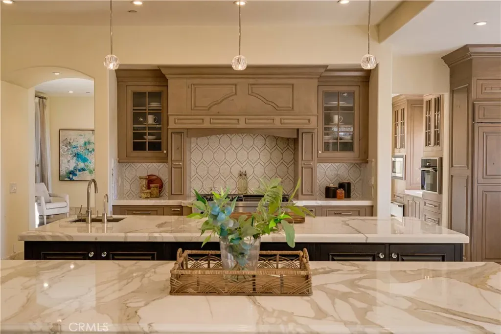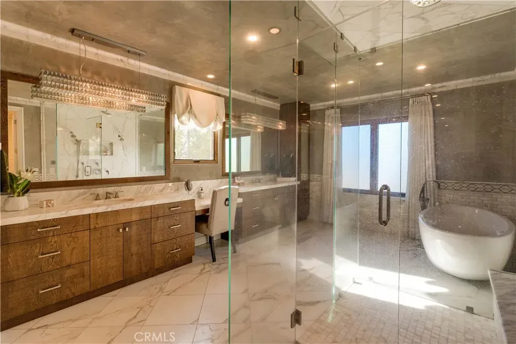The thoughtfully designed backyard is ideal for both entertaining and everyday enjoyment, featuring a resort-style pool, landscaped outdoor spaces, a children’s playground, and a separate guest house/ADU offering flexible living options. Inside, the home showcases timeless architecture with a spacious and functional floor plan. Natural travertine stone flooring flows throughout, complemented by elegant natural stone countertops and refined finishes. Each living space is generously proportioned, blending comfort with understated luxury.