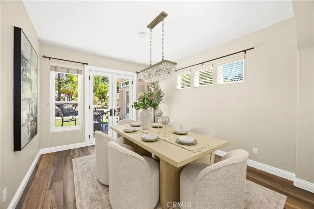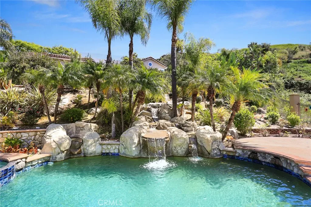 The backyard is a true showpiece—a tropical oasis featuring a sparkling pool and spa, cascading waterfalls, fire features, and beautifully landscaped grounds with ambient lighting. Multiple French doors, sliders, and expansive windows throughout the home create a seamless connection between indoor and outdoor spaces, making it an entertainer’s dream.