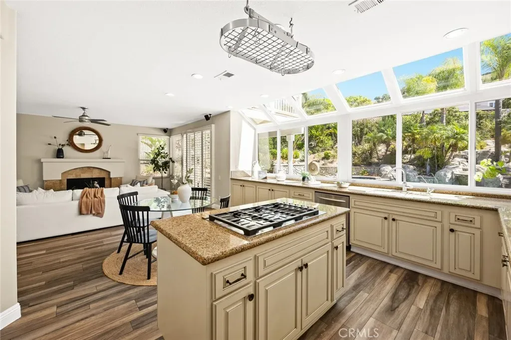 The gourmet kitchen is both stylish and functional, featuring granite countertops, a large center island, walk-in pantry, and expansive windows that flood the space with natural light while framing tranquil views of cascading waterfalls. Open to the kitchen, the inviting family room offers a cozy gas fireplace, custom French doors, and direct access to the backyard—perfect for effortless indoor-outdoor living.
