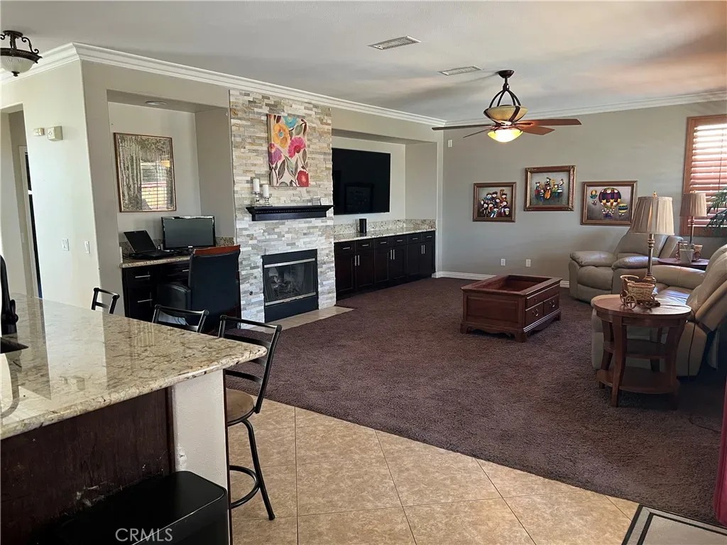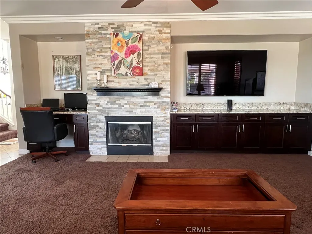 Step inside to soaring ceilings and light-filled formal living and dining spaces, leading into an open kitchen with granite countertops, stainless steel appliances, and a breakfast nook that flows seamlessly into the inviting family room with fireplace and built-in study desk.