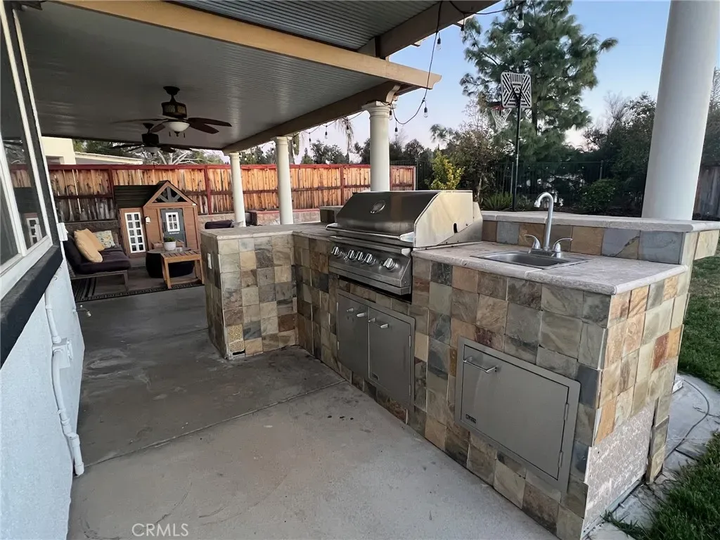 Designed for both everyday living and entertaining, the backyard features a covered patio, L-shaped outdoor BBQ kitchen, natural gas fire pit, and extended stamped concrete hardscape—creating a versatile outdoor living space complemented by a grass area.