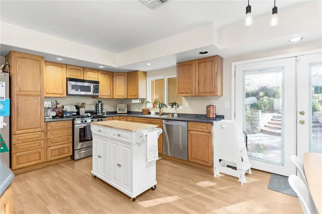 Move-in ready 3-bedroom, 2-bath Yucaipa home offering comfort, style, and energy efficiency with solar panels, a new whole-house fan, and a new AC unit. Enter into a large family room featuring attractive wood laminate flooring, perfect for everyday living and gatherings. The spacious dining area includes French doors that open to a park-like backyard, creating an ideal indoor-outdoor flow. The kitchen showcases Corian countertops, stainless steel appliances, abundant cabinetry, and generous prep space.
