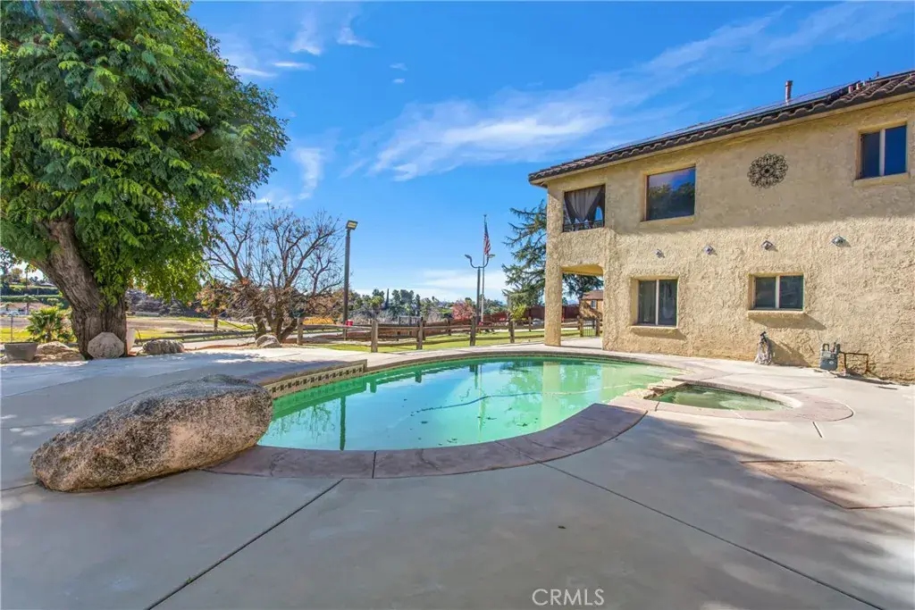 Resort-style living meets everyday comfort in this unique Yucaipa property set on an expansive 17,820 sq ft lot. This 3-bedroom, 3-bath home offers 1,944 sq ft of thoughtfully designed living space with water shares and solar ( loan) for energy efficiency and long-term savings. The interior was completely rebuilt in 2010 and includes sound-resistant walls and insulation, while the pool, HVAC system, Electrical and windows were also redone for added efficiency. Behind a fully fenced yard with remote gate access, the property features an entertainer’s backyard complete with a sparkling pool and spa, 5-hole putting green, dog run, and abundant space for RV parking, boat, work trucks, or recreational toys. Inside, the open-concept layout showcases custom finishes throughout, including a living room fireplace, custom kitchen cabinetry, granite countertops and center island, pantry, travertine flooring, and a dining area. The main level includes a 3/4 bathroom with direct pool and backyard access, a convenient laundry room, and a flexible utility or home office space. Upstairs, two bedrooms share a well-appointed bathroom with a granite vanity, while the primary suite offers a private fireplace, walk-in closet, and spa-inspired bathroom with his and her sinks, soaking tub, and separate shower, along with a screened-in private balcony to enjoy the views while staying cool in the summer months. A detached two-car garage and two additional storage sheds provide ample space for tools, hobbies, and storage. Custom finishes, thoughtful upgrades, and resort-style outdoor living make this home a rare opportunity. Where every day feels like a getaway and your short game just keeps getting better!