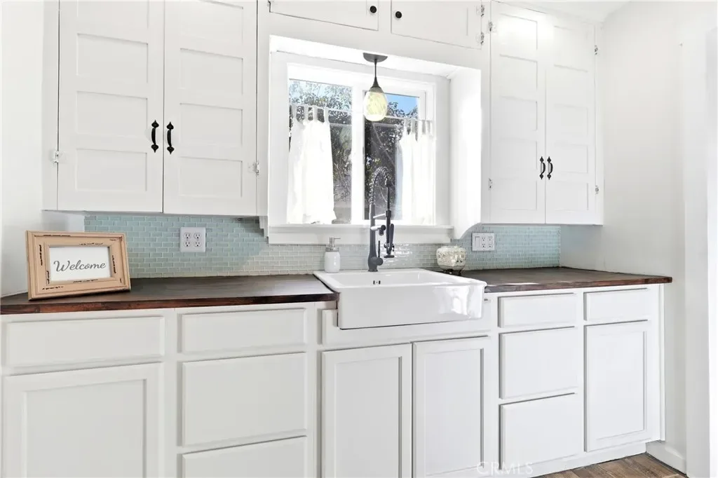 The front home features 2 bedrooms and 1 bath, offering a light-filled, spacious family room with newer windows, recessed lighting, and a ceiling fan. The living space flows seamlessly into a charming dining area with built-in cabinetry and custom ceiling details. The upgraded kitchen includes newer appliances (refrigerators included in both units), a farmhouse sink with matte black fixtures, and butcher block countertops. Enjoy outdoor living with a welcoming front patio and a private backyard—perfect for entertaining or play.