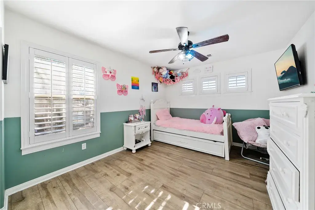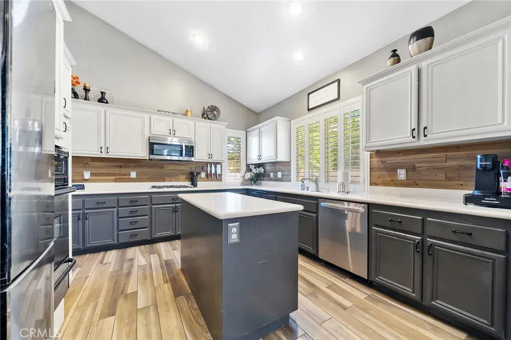 The heart of the home is a spacious, entertainer’s kitchen featuring gas appliances, Corian countertops, abundant cabinetry, and a seamless flow into the main living areas. All kitchen appliances are included, and plantation shutters throughout add timeless elegance while enhancing natural light.