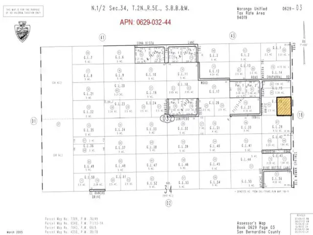 2.3 Acre Residential Corner Lot, NE corner of Highway 247 and Chaparral Rd. (APN: 0629-032-44) GPS: 34.218817, -116.439915 This 2.3 acre corner lot is located in Yucca Valley, CA. San Bernardino County has zoned this property Homestead Valley/Rural Living (HV/RL). The primary use is residential homes, some of the other permitted uses within this zoning are: accessory crop production, agricultural accessory structure, small family daycare facility or licensed residential care facility. Commercial renewable energy facilities are permitted in RL zoning according to the San Bernardino Development Code. 300 Ft of Highway Frontage! Overhead electricity is approx 300 Ft W of the property. Bighorn-Desert Water Agency services the area and provides water. Residents have septic tanks for their sewer needs and propane tanks for their gas needs. Floodway maps show the property is NOT in any flood zones and there is NO blue line on the property. Living in Yucca Valley, CA, offers the perfect blend of desert charm and modern conveniences. Imagine waking up to the gentle rustle of Joshua trees and the warm desert sun casting its glow over the landscape. With easy access to Joshua Tree National Park, residents can explore miles of hiking trails, marvel at unique rock formations, and experience the awe-inspiring beauty of the desert. Yucca Valley’s vibrant community scene boasts eclectic shops, delicious eateries, and local art galleries, providing endless opportunities for exploration and connection. Whether you’re seeking adventure in the great outdoors or a cozy night in with friends, Yucca Valley welcomes you with open arms and the promise of a fulfilling desert lifestyle. This property does not yet have an address. While the boundary lines on the map offer a glimpse, they are only approximate. A Buyer should verify boundaries, zoning and utilities, ensuring every aspect aligns with their vision for the property.