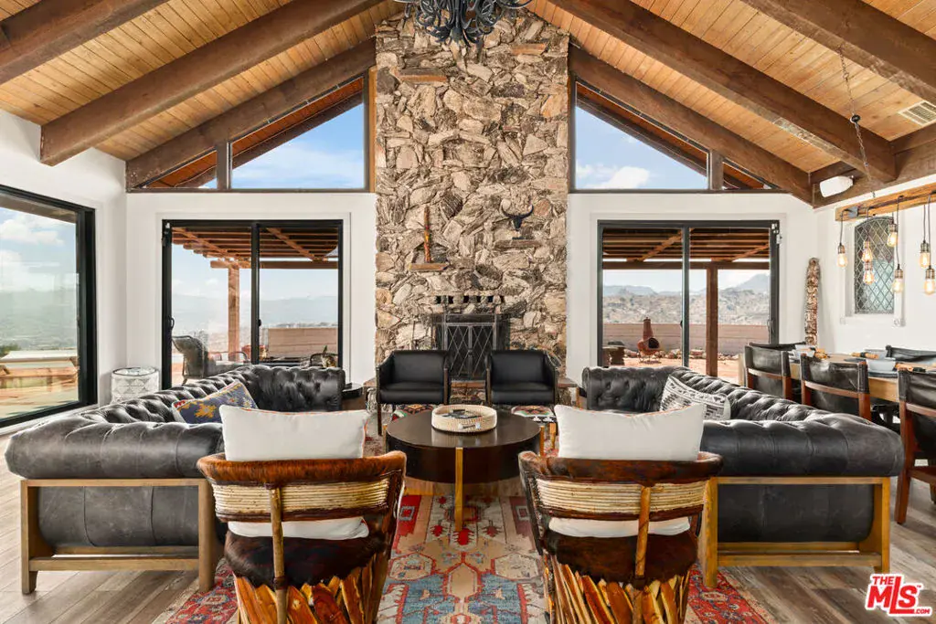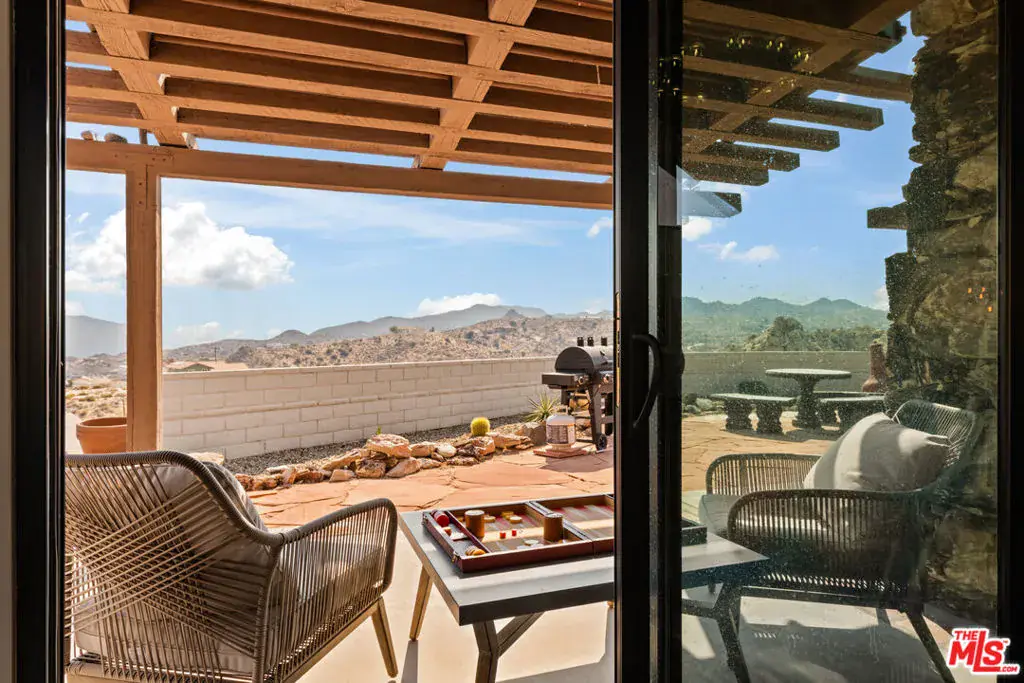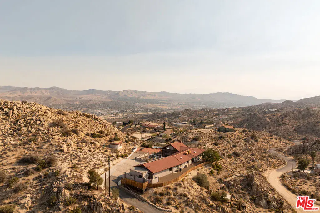 PRICE REDUCED & READY TO SELL! Spectacular 4-Bedroom Desert Estate with Infinity Pool, Panoramic Views & Custom Finishes on 2.5 Acres. Welcome to your private hillside oasisan architecturally distinctive 4-bedroom, 2.5-bathroom home offering approximately 3,400 square feet of beautifully crafted living space, perched on 2.5 acres with unobstructed high-desert and mountain views. This one-of-a-kind property is perfect for those seeking luxury, privacy, and dramatic natural beauty.From the moment you arrive, the gated entry and circular drive set the tone for this custom Spanish-influenced retreat. A tiered fountain anchors the front courtyard, surrounded by low-maintenance desert landscaping and mature native plants. Step through hand-carved double entry doors into a grand living space where vaulted tongue-and-groove ceilings soar overhead and massive picture windows frame jaw-dropping views. A striking stone fireplace serves as the centerpiece of the great room, seamlessly connecting indoor living to the expansive outdoor entertaining areas.Designed for both comfort and entertaining, the open-concept floorplan includes a stunning chef’s kitchen with quartz countertops, artisan backsplash tile, custom open shelving, stainless steel appliances, and wraparound corner windows that capture endless desert light. A charming dining nook adorned with three stained-glass arched windows and wood-paneled walls offers an intimate setting for meals with family and friends.The luxurious primary suite features its own private slider to the pool patio, mountain views, and a beautifully designed en-suite bath. Three additional bedrooms provide ample space for guests, a home office, or creative use. Throughout the home, you’ll find curated finishes including handcrafted lighting, vintage tile, wood floors, and rustic design details that enhance the home’s warm and welcoming character.The resort-style backyard is the crown jewel of the property. An infinity-edge pool and spa appear to spill directly into the horizon, while the flagstone pool deck offers multiple lounge areas, fire pit, and a setting unlike any other. Whether you’re hosting sunset gatherings or enjoying serene morning coffee with a view, this space is designed to inspire.Other highlights include a detached bonus structure (perfect for a studio or guest use), ample parking, and proximity to hiking, downtown amenities, and Joshua Tree National Park.