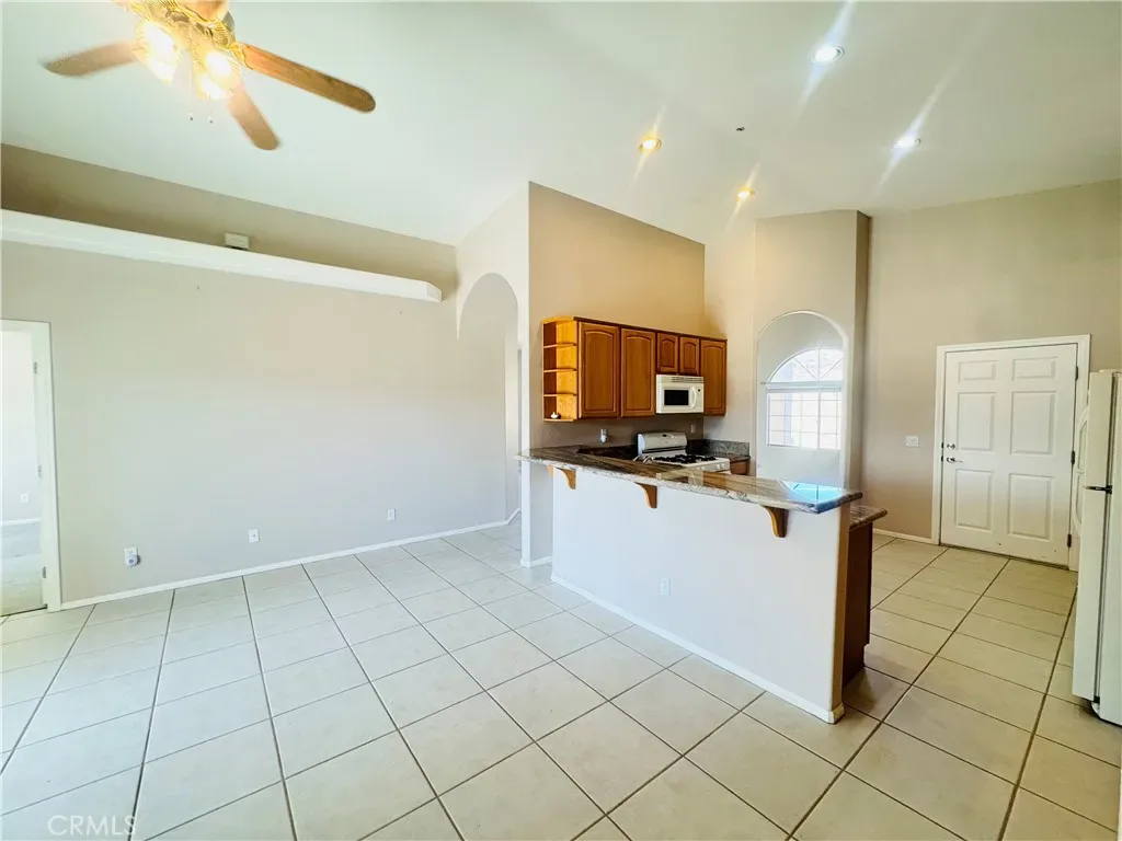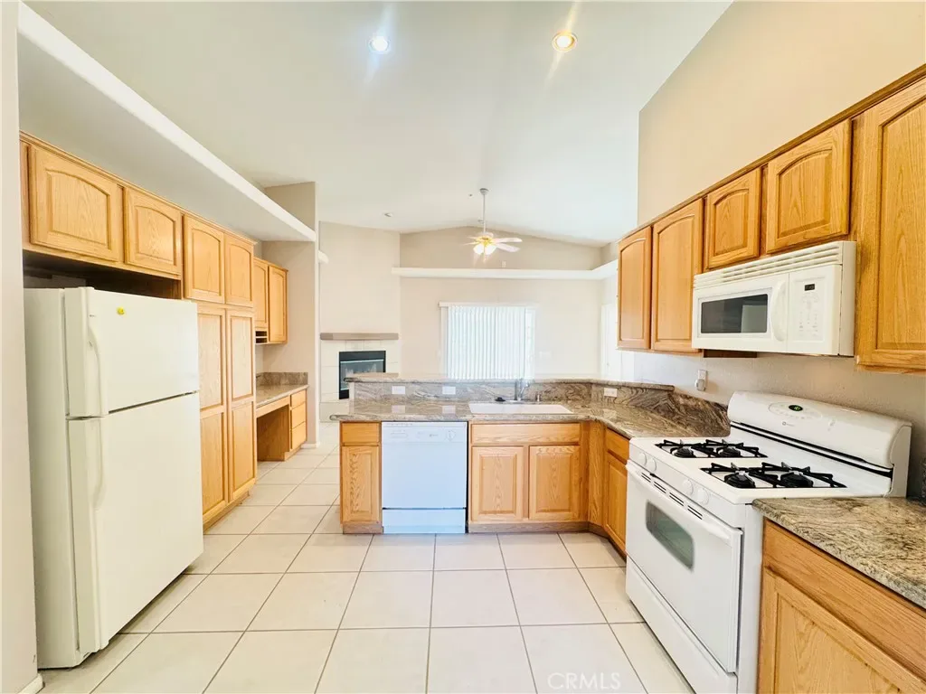 Step inside to an open-concept living area featuring vaulted ceilings, easy-maintenance tile flooring, and a cozy fireplace. The large kitchen flows seamlessly into the living space, offering ample cabinet storage, granite-style countertops, white appliances, and a breakfast bar perfect for casual dining