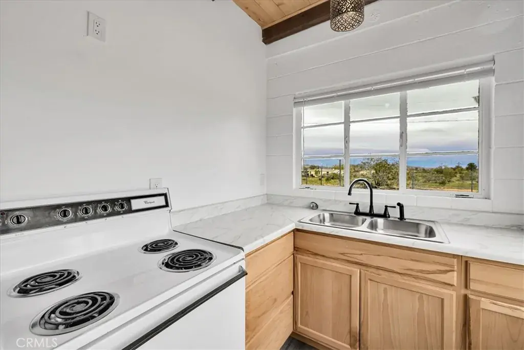 Set on 2 acres in the sought-after Flamingo Heights area of Yucca Valley, this 3 bedroom, 2 bath home offers space, privacy, and classic high desert character surrounded by mature Joshua trees and wide-open views. The expansive living room is a true centerpiece, featuring wood-beamed ceilings, wood-look flooring, built-in storage, and a dramatic stone hearth corner fireplace that anchors the space with warmth and charm. The kitchen is both functional and inviting, with quartz countertops, warm wood cabinetry, and large windows that bring in natural light and desert scenery. The primary bedroom is generously sized and filled with light, complete with a ceiling fan and an attached bath featuring a jetted tub/shower combo and a stylish basin sink. A comfortable guest bedroom includes two closets for ample storage, while the second bathroom stands out with a claw foot tub, a separate quartz-enclosed shower, and a pedestal sink. The third bedroom offers large windows and its own outdoor access, making it ideal for guests, a home office, or creative space. Outside, the property showcases mature Joshua trees, open desert surroundings, and sweeping views that define the Flamingo Heights lifestyle. With room to roam and a layout that blends rustic appeal with thoughtful updates, this home is a peaceful desert retreat with timeless character.
