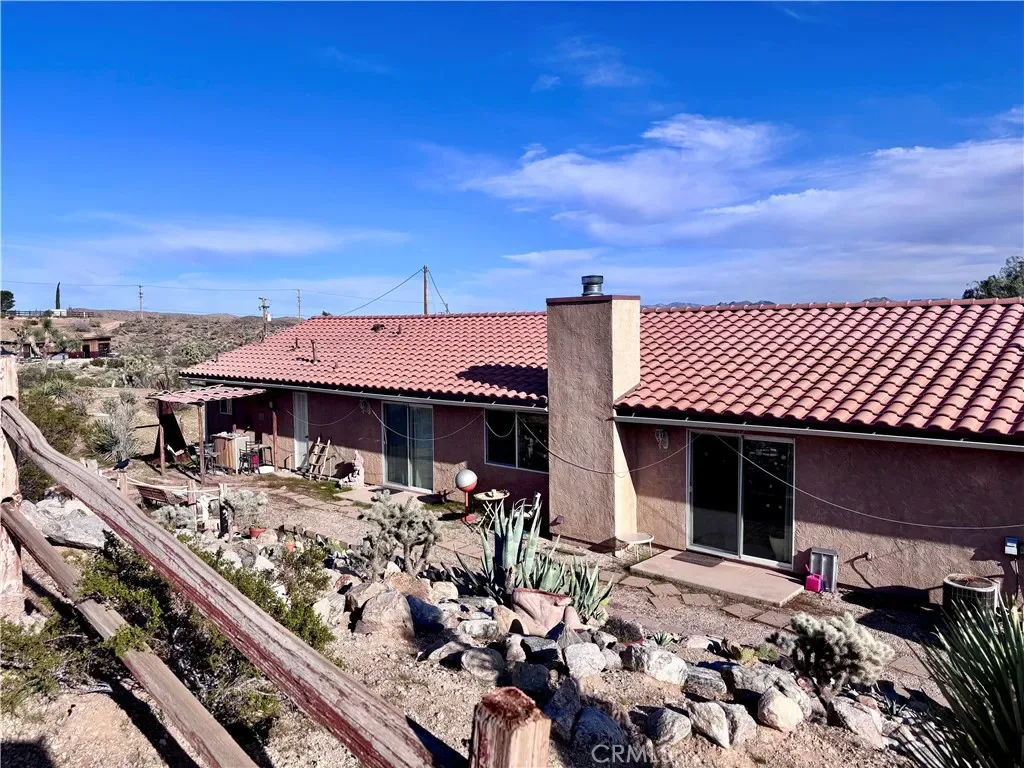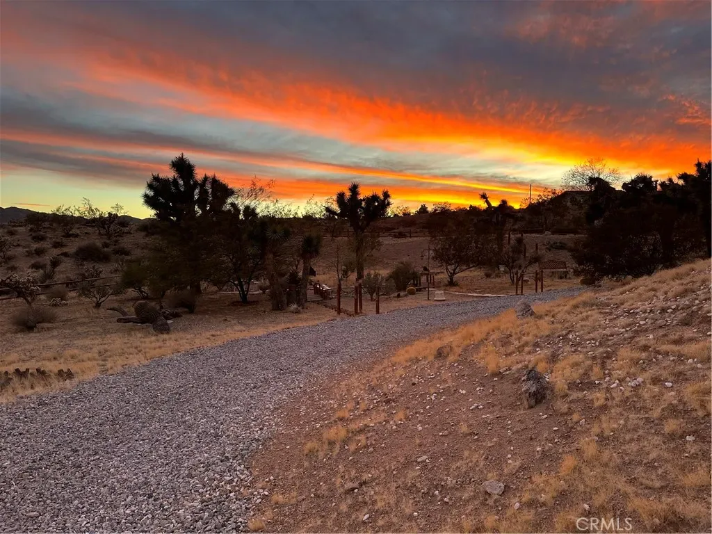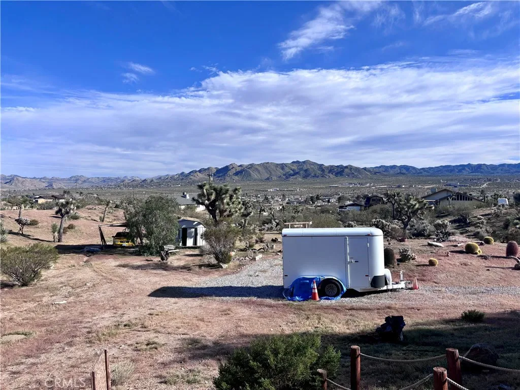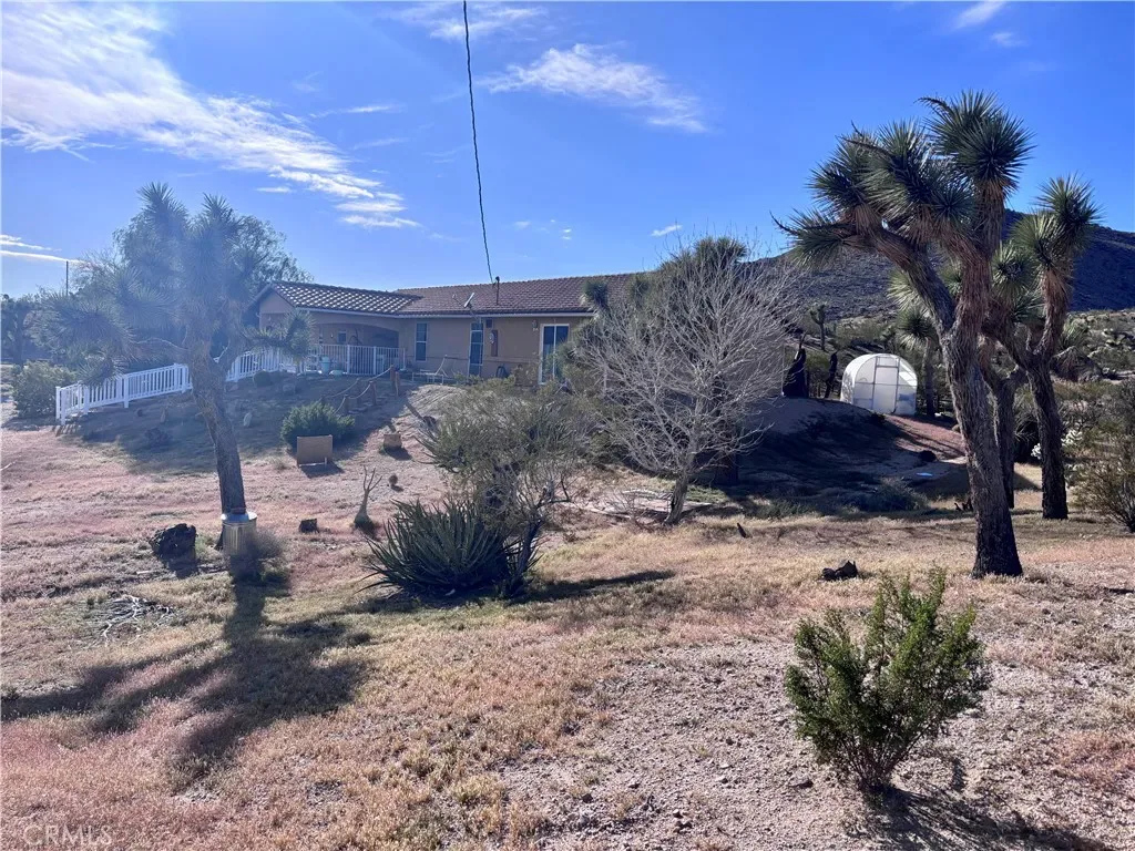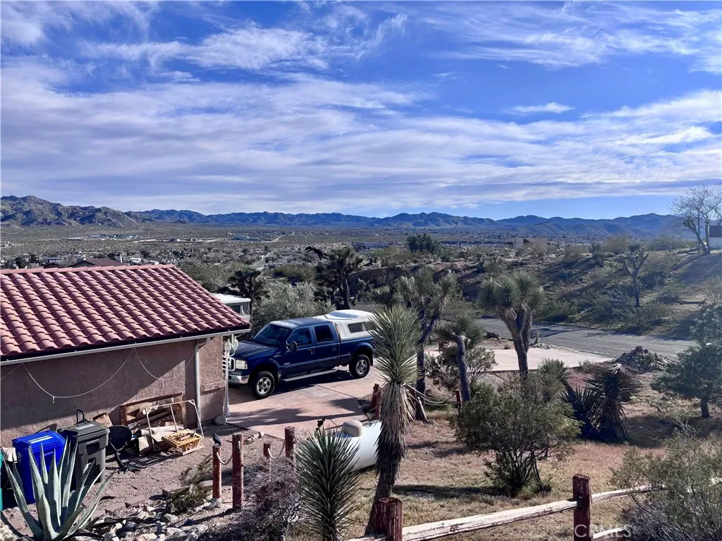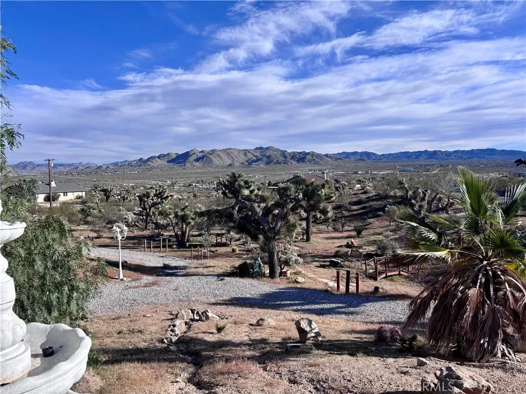 Discover a captivating city lights view from this 4-bedroom, 3-bath home nestled in a tranquil cul-de-sac freshly paved, boasting a wilderness panorama view. This private oasis, was built in 2004, spans .85 acres . The entrance is nothing short of dramatic, providing the perfect perch to savor both sunrises and sunsets. Featuring a tiled roof and cool tiled floors throughout, the home exudes a refreshing ambiance. The spacious kitchen offers a scenic backdrop, complete with double ovens. A fireplace graces the living room, while ceiling fans adorn every room. The dining room, with glass sliders leading to the rear yard, presents a dramatic view for your dining pleasure. The expansive master suite includes a generous walk-in closet and glass sliders, inviting in the cool morning and evening breeze. A second master suite, with its own full bath, also opens up to the rear yard through glass sliders. The oversized 2-car garage is impeccably finished with epoxy floors, complemented by a concrete driveway. A green house in the rear garden adds to the property’s charm. With numerous amenities to offer, this one-of-a-kind residence is a rare find. Don’t miss out on the unparalleled location and breathtaking views! Explore the captivating beauty of Joshua Tree National Park and indulge in a delightful shopping experience in the charming town of Yucca Valley. Immerse yourself in the stunning landscapes of Joshua Tree National Park, located in close proximity.