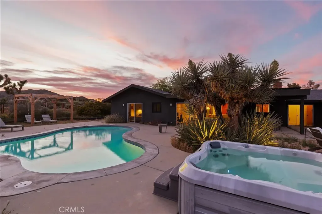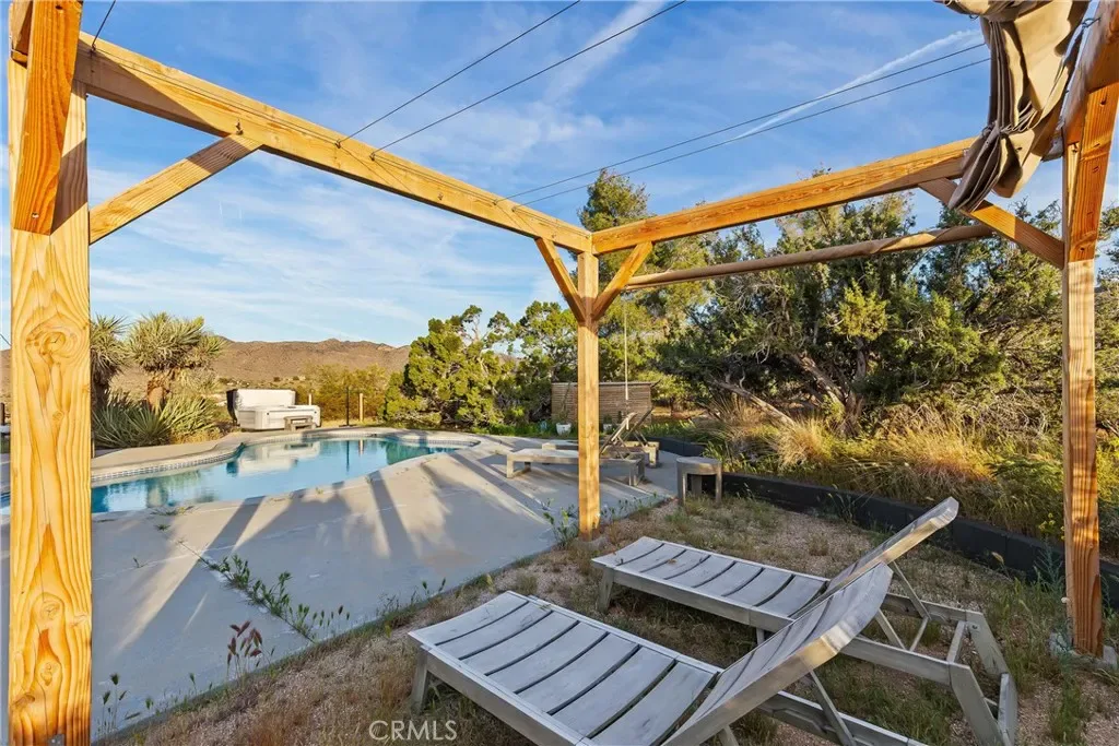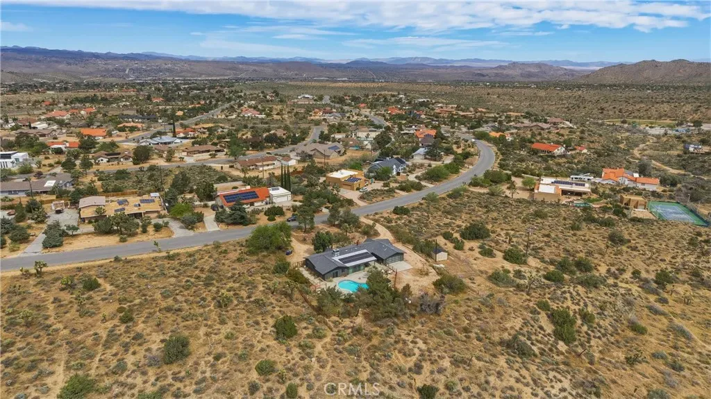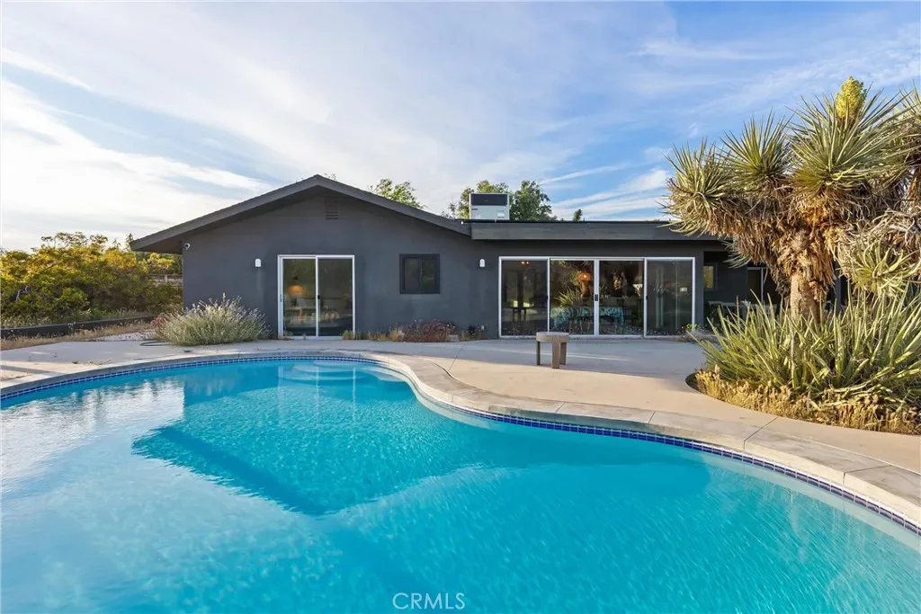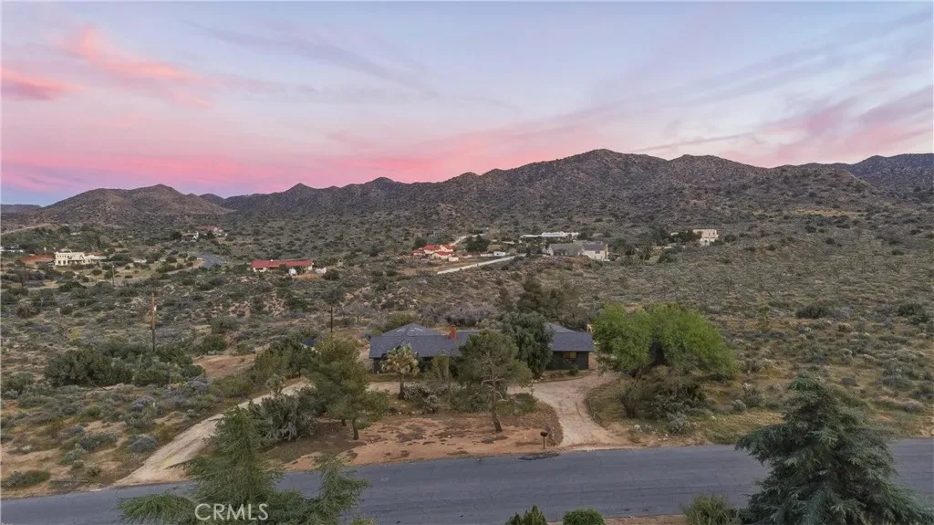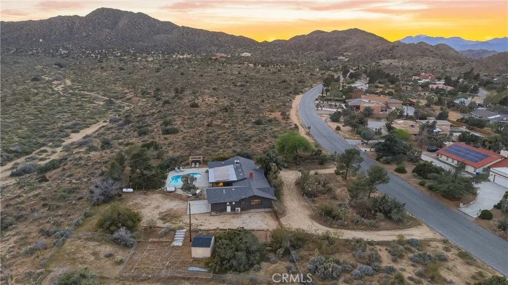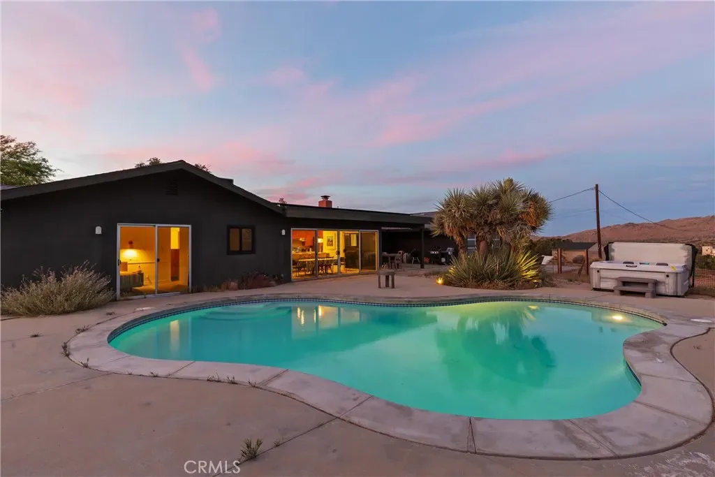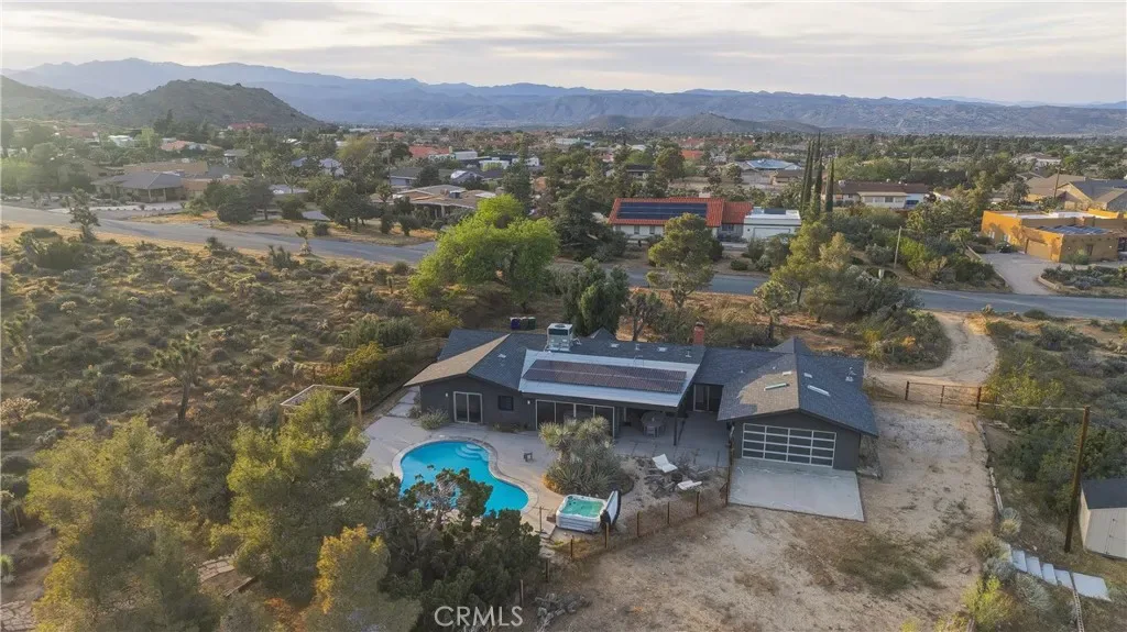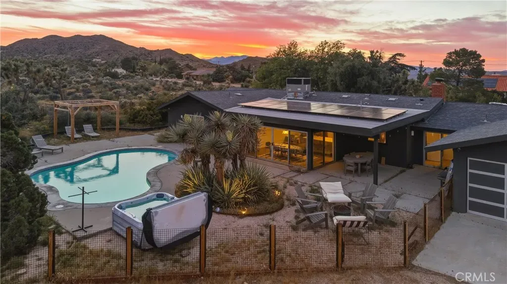 Set on 1.65 acres with unobstructed views toward Joshua Tree National Park, this thoughtfully updated ranch home offers privacy, comfort, and an easy connection to the surrounding desert. Clean, tasteful updates complement the home’s original character, including a handmade vintage rock fireplace that anchors the main living space. The spacious kitchen features rich hardwood cabinetry, generous storage, and room to cook, gather, and entertain. The layout includes three bedrooms, two and a half bathrooms, a separate office, an oversized bonus room currently used as a private screening room, and an attached finished studio that could also serve as a workshop or high-finish garage. An owned solar system adds long-term value, and every day efficiency. Outside, mature desert landscaping, sculptural cactus, and established trees create a beautifully grounded setting. The pool and spa sit beneath open skies, while the open land beyond and trail access just past the back gate give the property a rare sense of space and privacy. Set in a great location with easy access to town, the national park, and the best of the area, this is a home that works beautifully as a full-time residence, second home, or standout short-term rental.