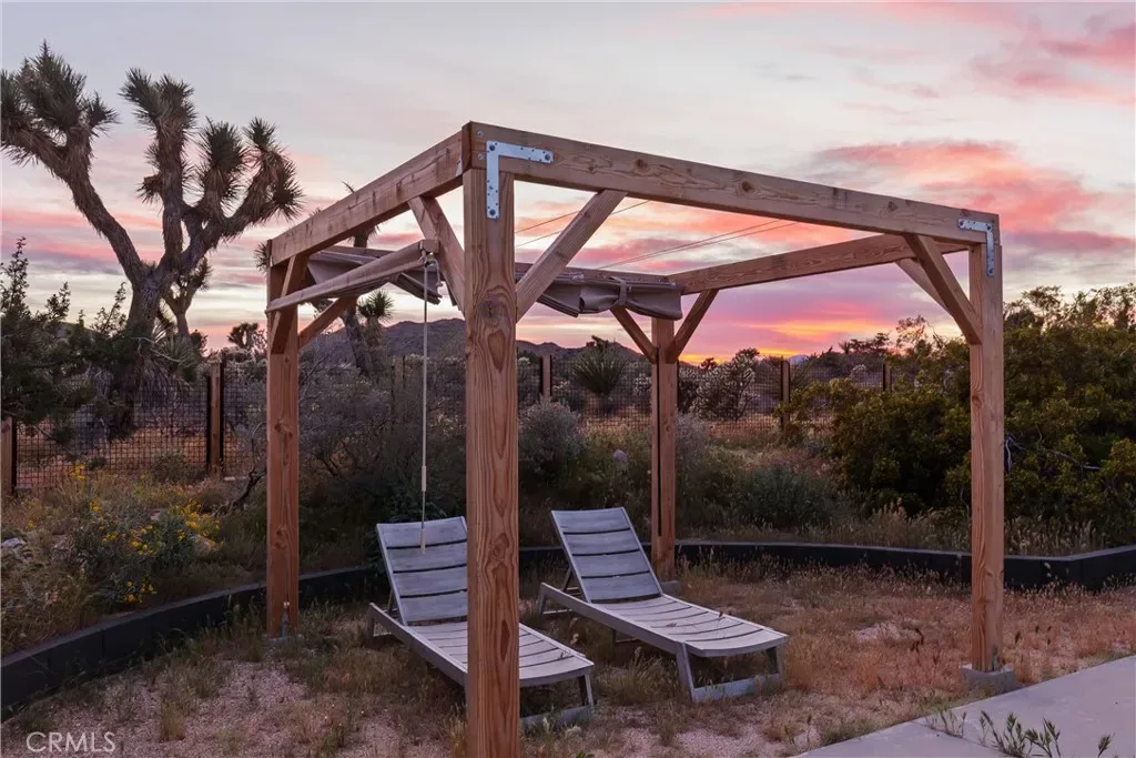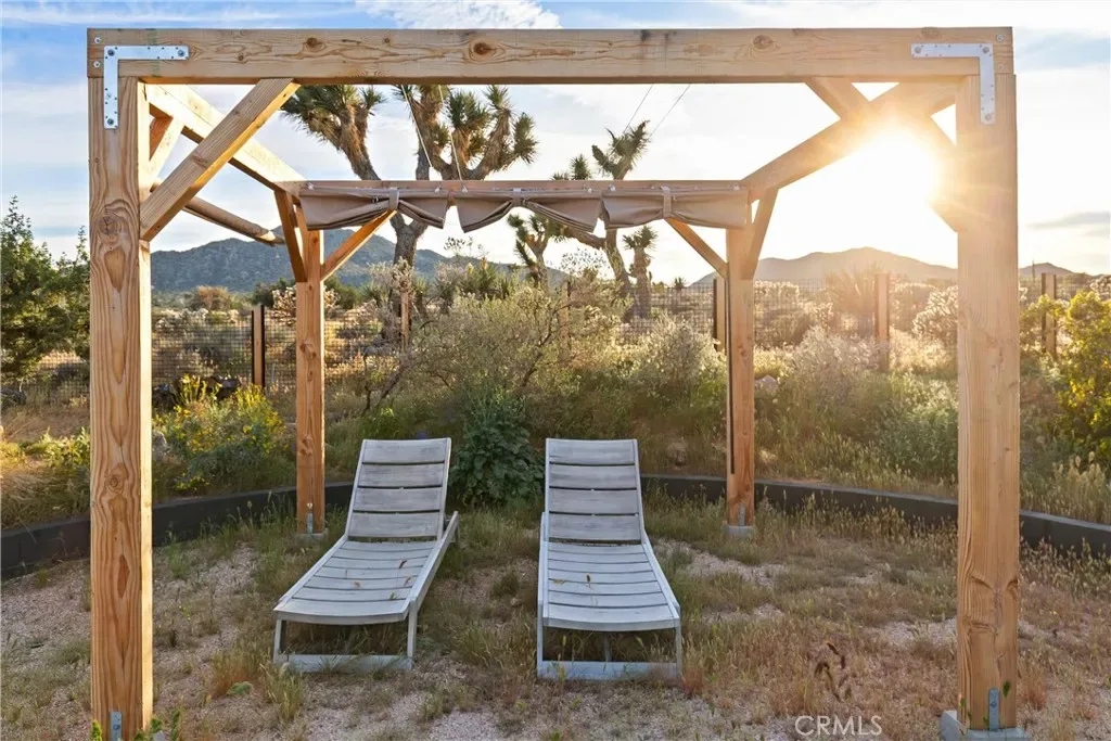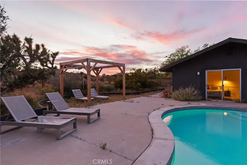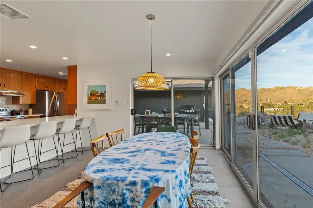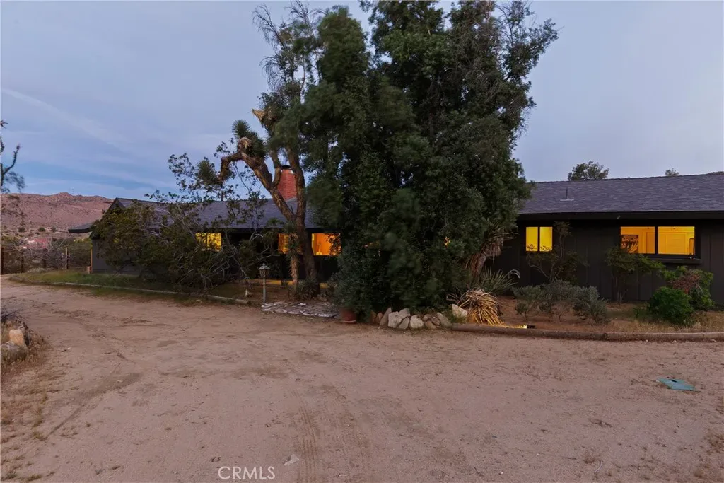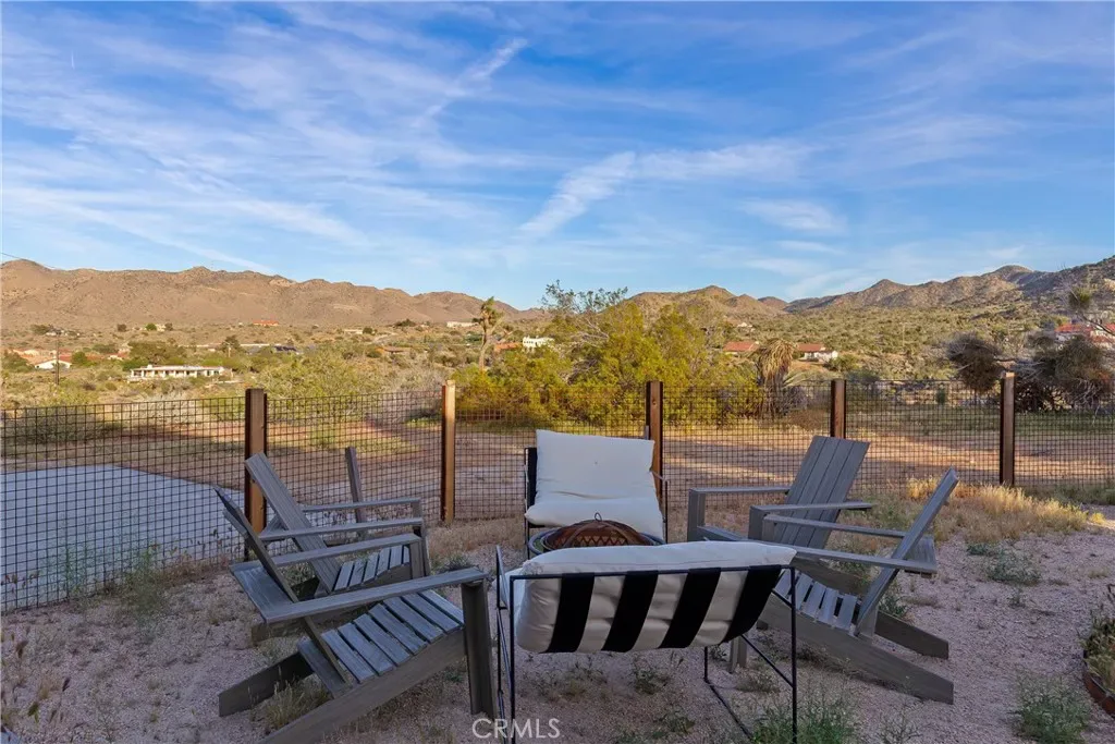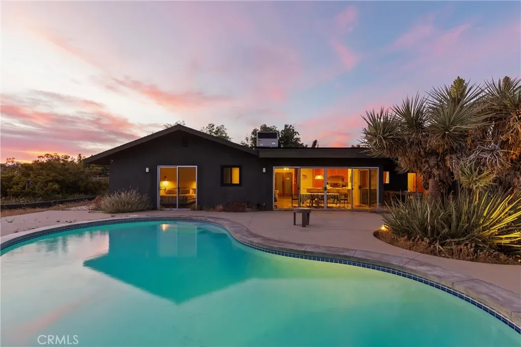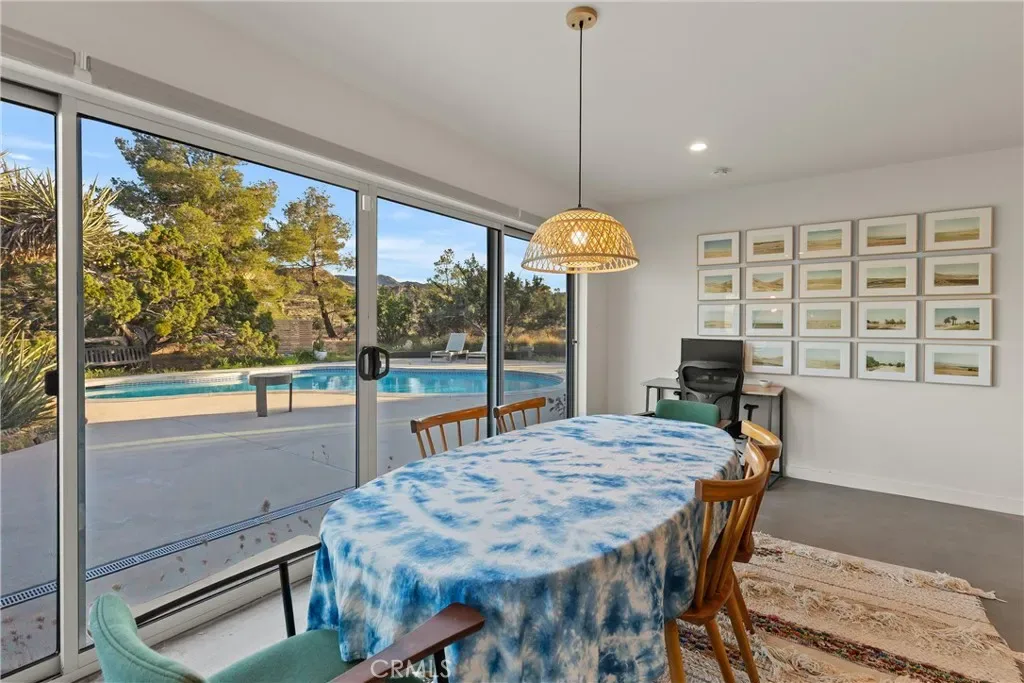 Set on 1.65 acres with unobstructed views toward Joshua Tree National Park, this thoughtfully updated ranch home offers privacy, comfort, and an easy connection to the surrounding desert. Clean, tasteful updates complement the home’s original character, including a handmade vintage rock fireplace that anchors the main living space. The spacious kitchen features rich hardwood cabinetry, generous storage, and room to cook, gather, and entertain. The layout includes three bedrooms, two and a half bathrooms, a separate office, an oversized bonus room currently used as a private screening room, and an attached finished studio that could also serve as a workshop or high-finish garage. An owned solar system adds long-term value, and every day efficiency. Outside, mature desert landscaping, sculptural cactus, and established trees create a beautifully grounded setting. The pool and spa sit beneath open skies, while the open land beyond and trail access just past the back gate give the property a rare sense of space and privacy. Set in a great location with easy access to town, the national park, and the best of the area, this is a home that works beautifully as a full-time residence, second home, or standout short-term rental.