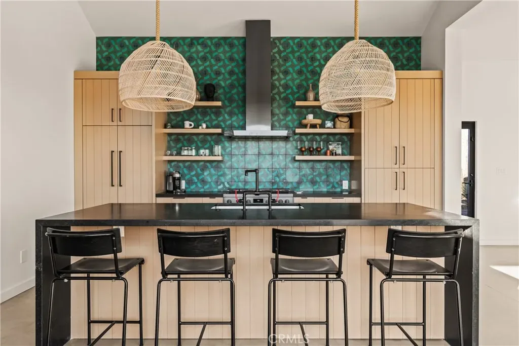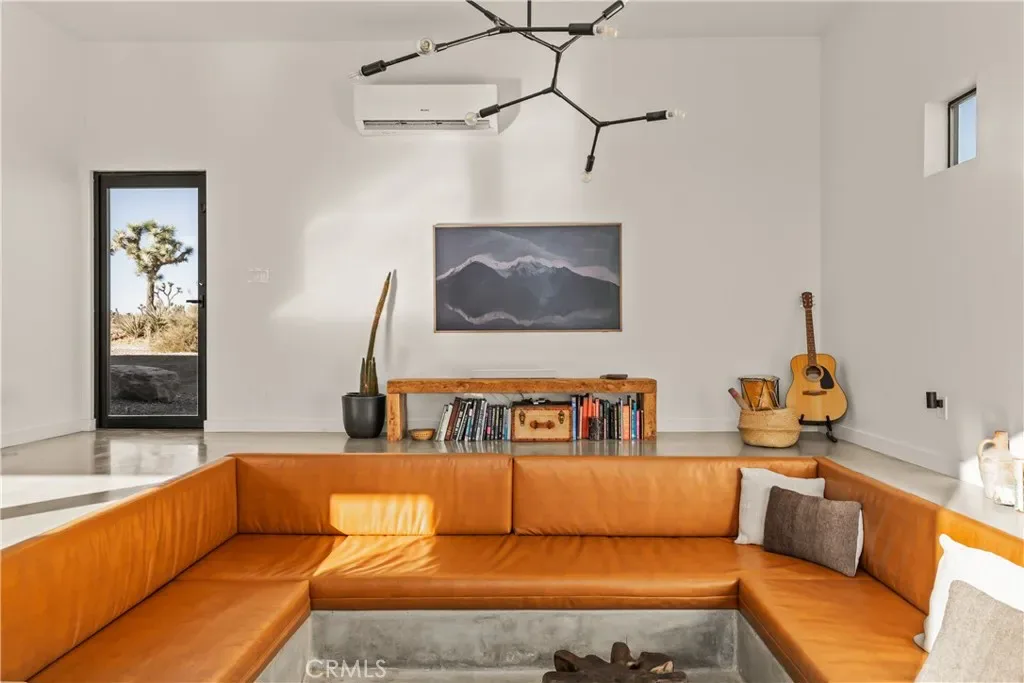 Inside, the home opens to an airy, light-filled interior anchored by a dramatic sunken conversation pit—an inviting focal point for both everyday living and entertaining. The open-concept living space flows into a chef’s kitchen featuring a 12-foot waterfall island, high-end finishes, and ample space for gathering. Oversized glass doors connect the interior to an outdoor dining patio with sweeping views of untouched desert terrain and distant ridgelines.