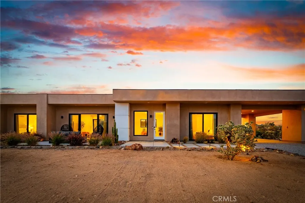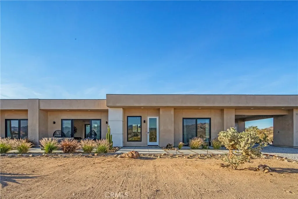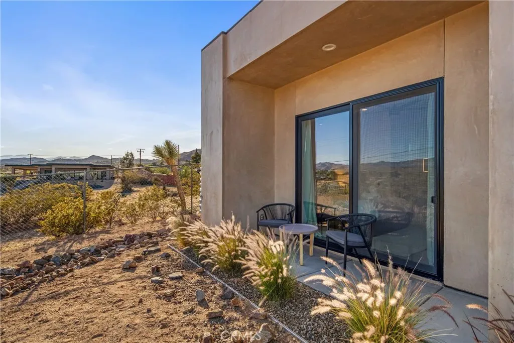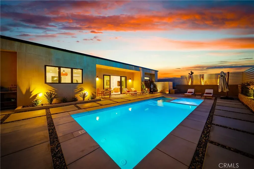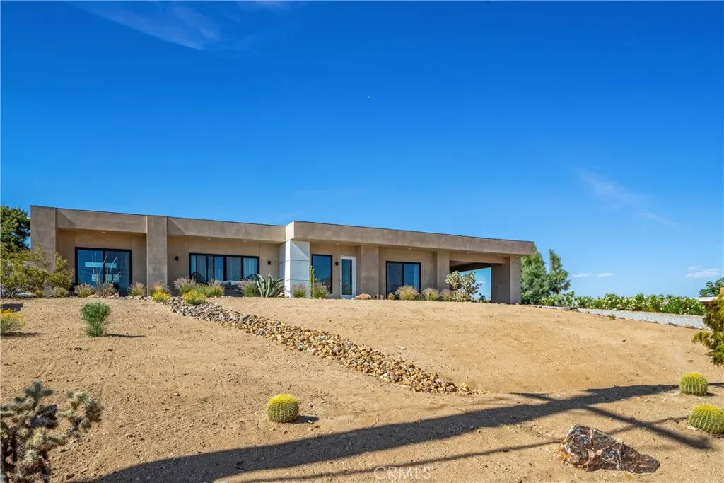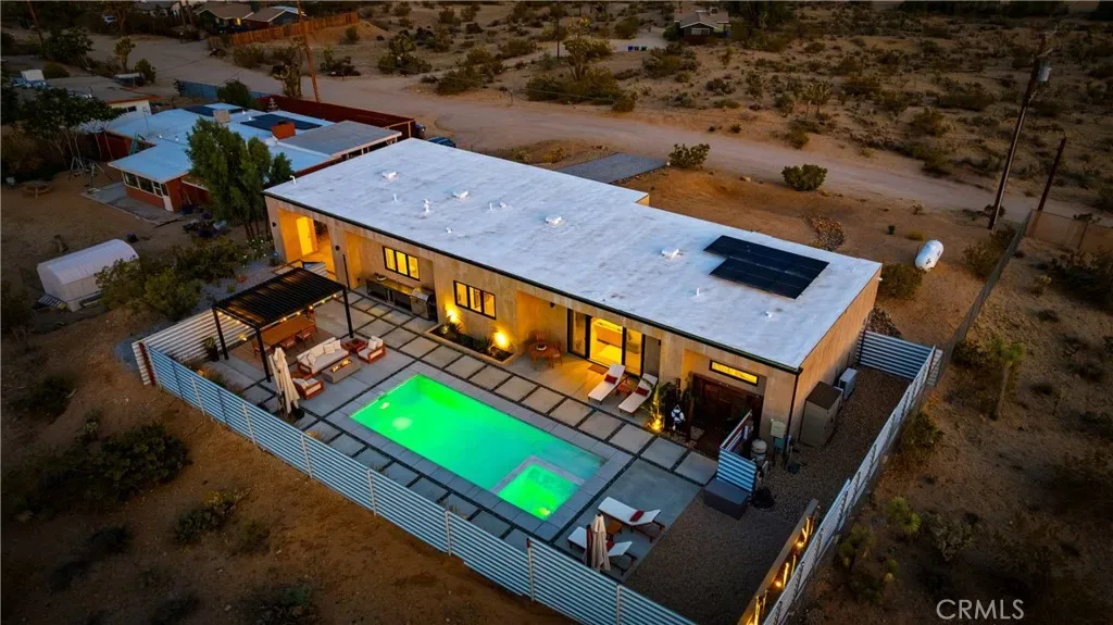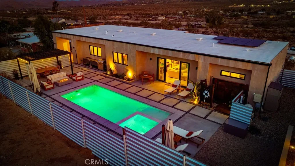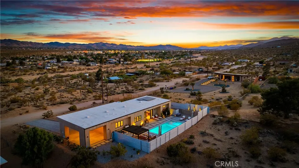 Experience elevated desert living in this newly constructed custom home, thoughtfully designed to capture the beauty and serenity of the Joshua Tree landscape. Positioned to take full advantage of sweeping valley views, the home offers a seamless connection between indoor comfort and outdoor tranquility through expansive windows and oversized sliding glass doors. The open-concept layout centers around a spacious great room, flanked by two generously sized bedrooms—each featuring its own ensuite bath—creating an ideal balance of privacy and flow. The kitchen is both functional and refined, complete with custom cabinetry, quartz countertops, stainless steel appliances, and a large island perfect for gathering and entertaining. Step outside to enjoy multiple living spaces designed for relaxation and entertaining, including a covered carport-style lounge area with built-in speakers and pre-wiring for a full entertainment setup. The private backyard retreat features a pool and spa, offering the perfect setting to unwind while taking in the desert’s unforgettable sunsets. Built with efficiency and modern living in mind, the home includes 2×6 construction with enhanced insulation, a high-efficiency zoned HVAC system, paid solar, EV charging, tankless water heater, and smart home pre-wiring throughout. A rare opportunity to own a modern desert retreat that blends thoughtful design, energy efficiency, and stunning natural surroundings.