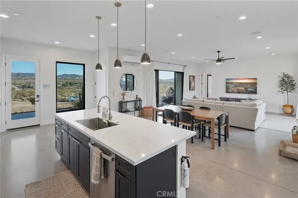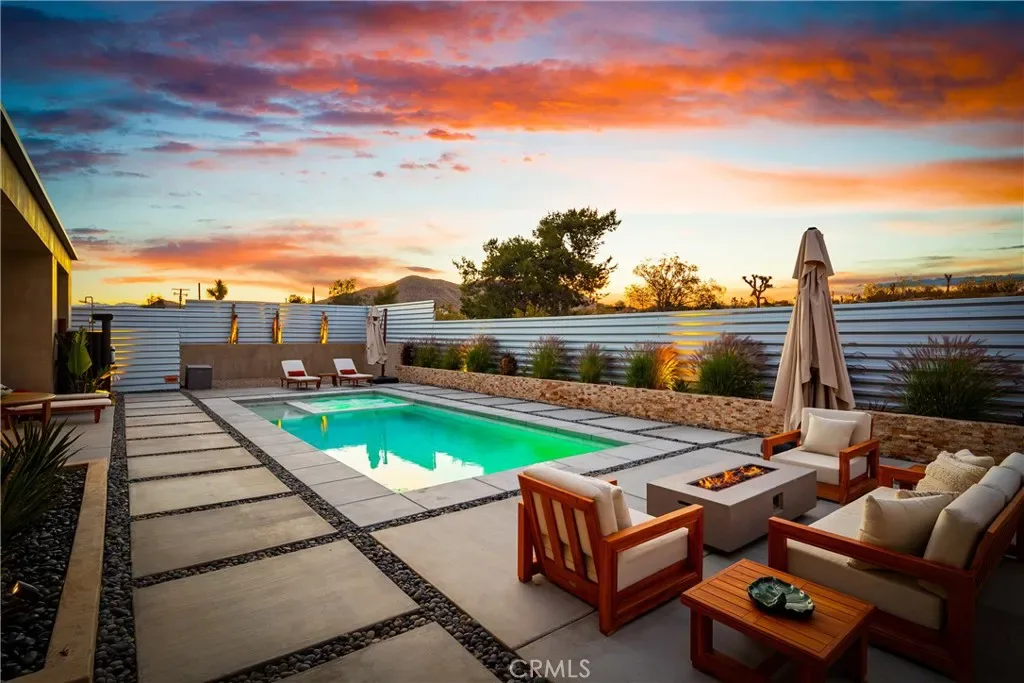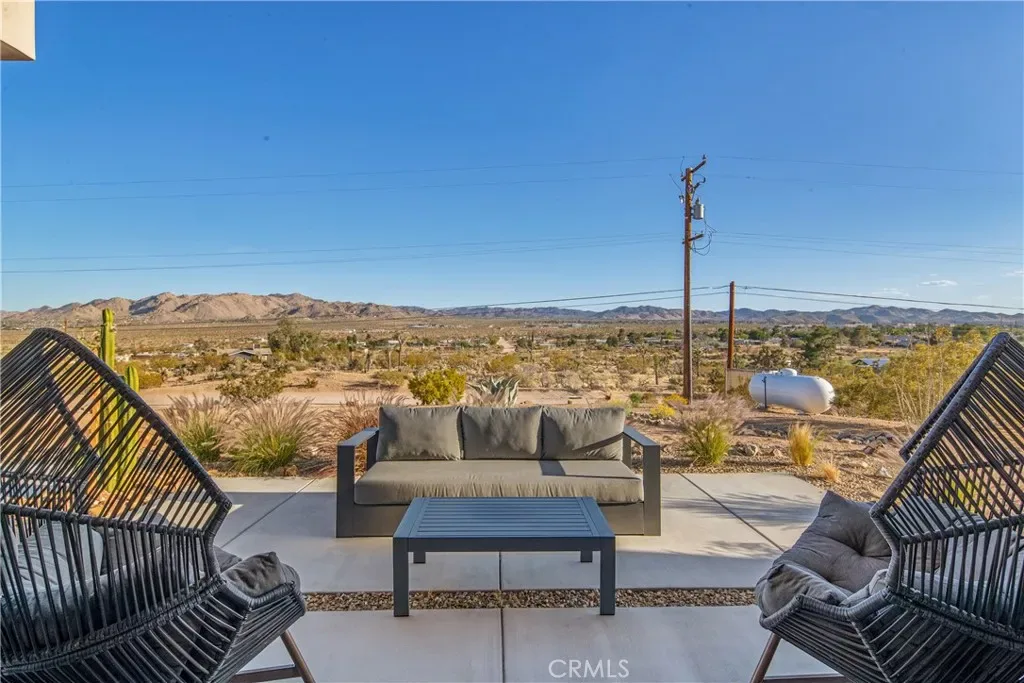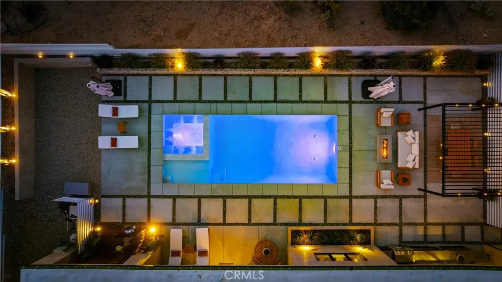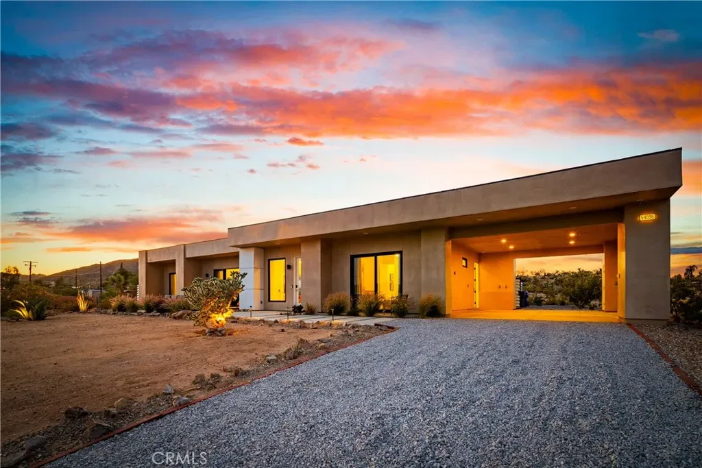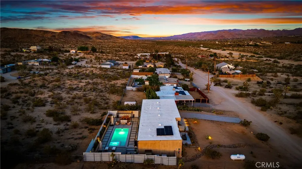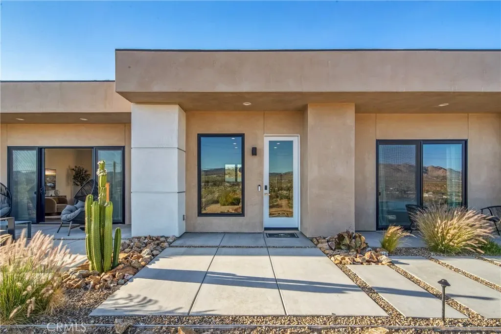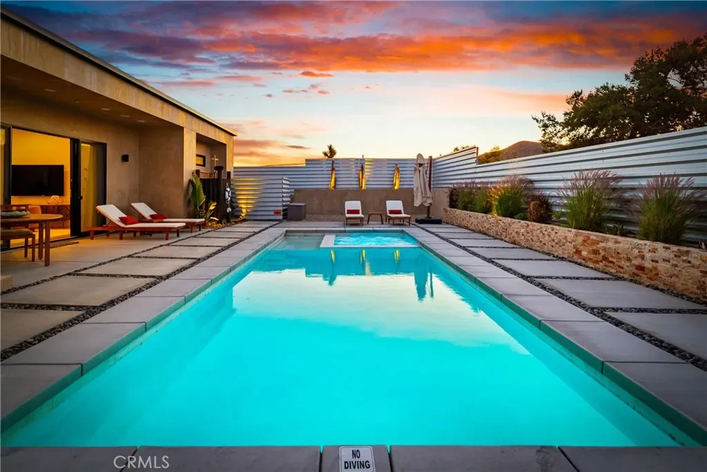 Experience elevated desert living in this newly constructed custom home, thoughtfully designed to capture the beauty and serenity of the Joshua Tree landscape. Positioned to take full advantage of sweeping valley views, the home offers a seamless connection between indoor comfort and outdoor tranquility through expansive windows and oversized sliding glass doors. The open-concept layout centers around a spacious great room, flanked by two generously sized bedrooms—each featuring its own ensuite bath—creating an ideal balance of privacy and flow. The kitchen is both functional and refined, complete with custom cabinetry, quartz countertops, stainless steel appliances, and a large island perfect for gathering and entertaining. Step outside to enjoy multiple living spaces designed for relaxation and entertaining, including a covered carport-style lounge area with built-in speakers and pre-wiring for a full entertainment setup. The private backyard retreat features a pool and spa, offering the perfect setting to unwind while taking in the desert’s unforgettable sunsets. Built with efficiency and modern living in mind, the home includes 2×6 construction with enhanced insulation, a high-efficiency zoned HVAC system, paid solar, EV charging, tankless water heater, and smart home pre-wiring throughout. A rare opportunity to own a modern desert retreat that blends thoughtful design, energy efficiency, and stunning natural surroundings.
