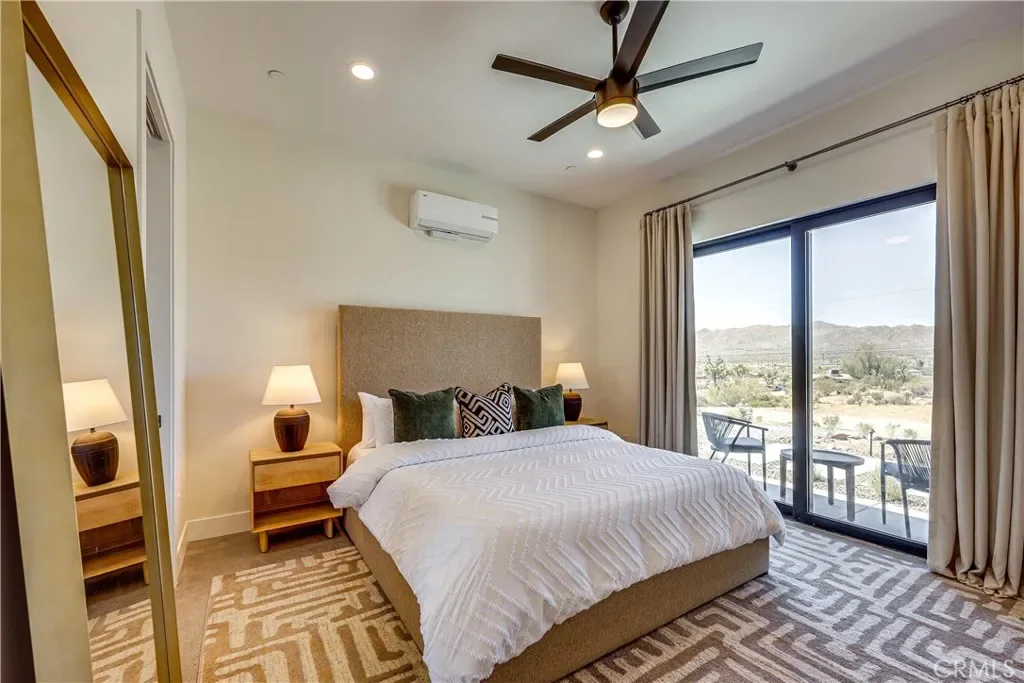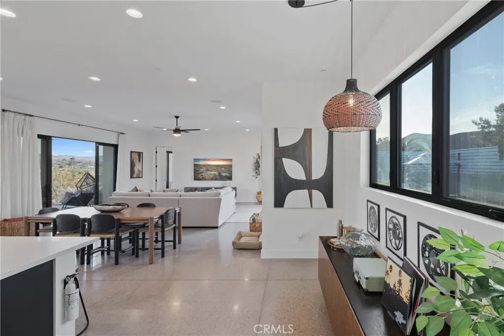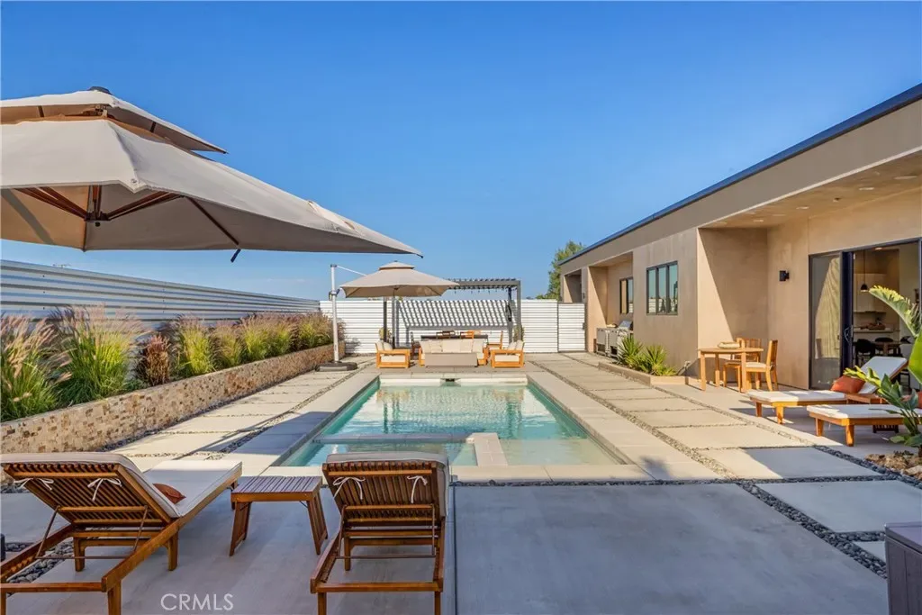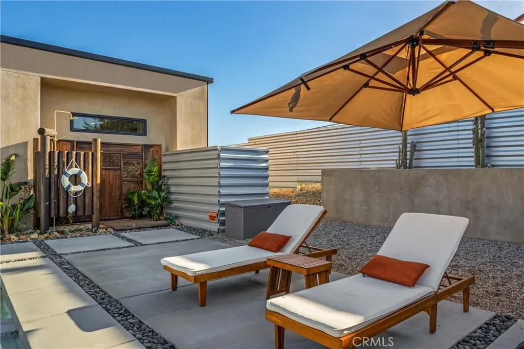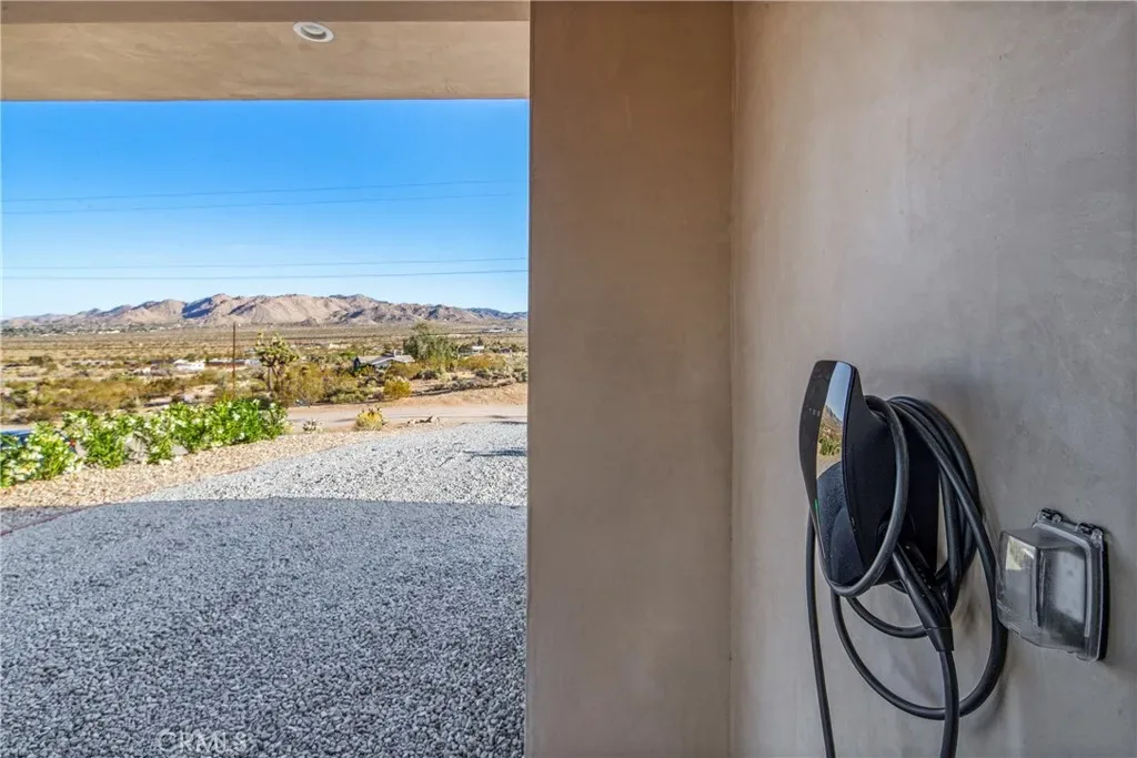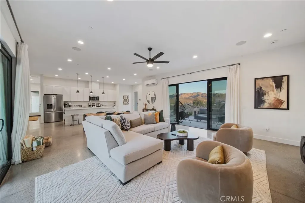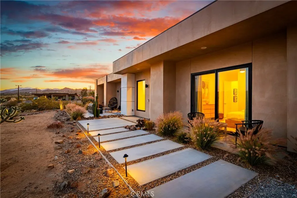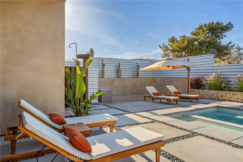 Experience elevated desert living in this newly constructed custom home, thoughtfully designed to capture the beauty and serenity of the Joshua Tree landscape. Positioned to take full advantage of sweeping valley views, the home offers a seamless connection between indoor comfort and outdoor tranquility through expansive windows and oversized sliding glass doors. The open-concept layout centers around a spacious great room, flanked by two generously sized bedrooms—each featuring its own ensuite bath—creating an ideal balance of privacy and flow. The kitchen is both functional and refined, complete with custom cabinetry, quartz countertops, stainless steel appliances, and a large island perfect for gathering and entertaining. Step outside to enjoy multiple living spaces designed for relaxation and entertaining, including a covered carport-style lounge area with built-in speakers and pre-wiring for a full entertainment setup. The private backyard retreat features a pool and spa, offering the perfect setting to unwind while taking in the desert’s unforgettable sunsets. Built with efficiency and modern living in mind, the home includes 2×6 construction with enhanced insulation, a high-efficiency zoned HVAC system, paid solar, EV charging, tankless water heater, and smart home pre-wiring throughout. A rare opportunity to own a modern desert retreat that blends thoughtful design, energy efficiency, and stunning natural surroundings.
