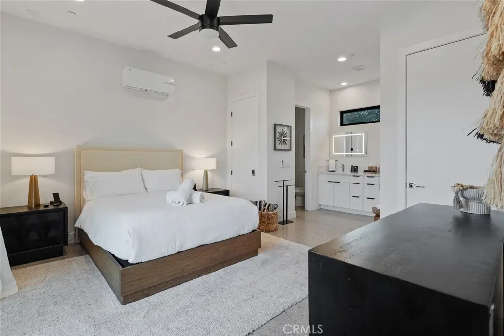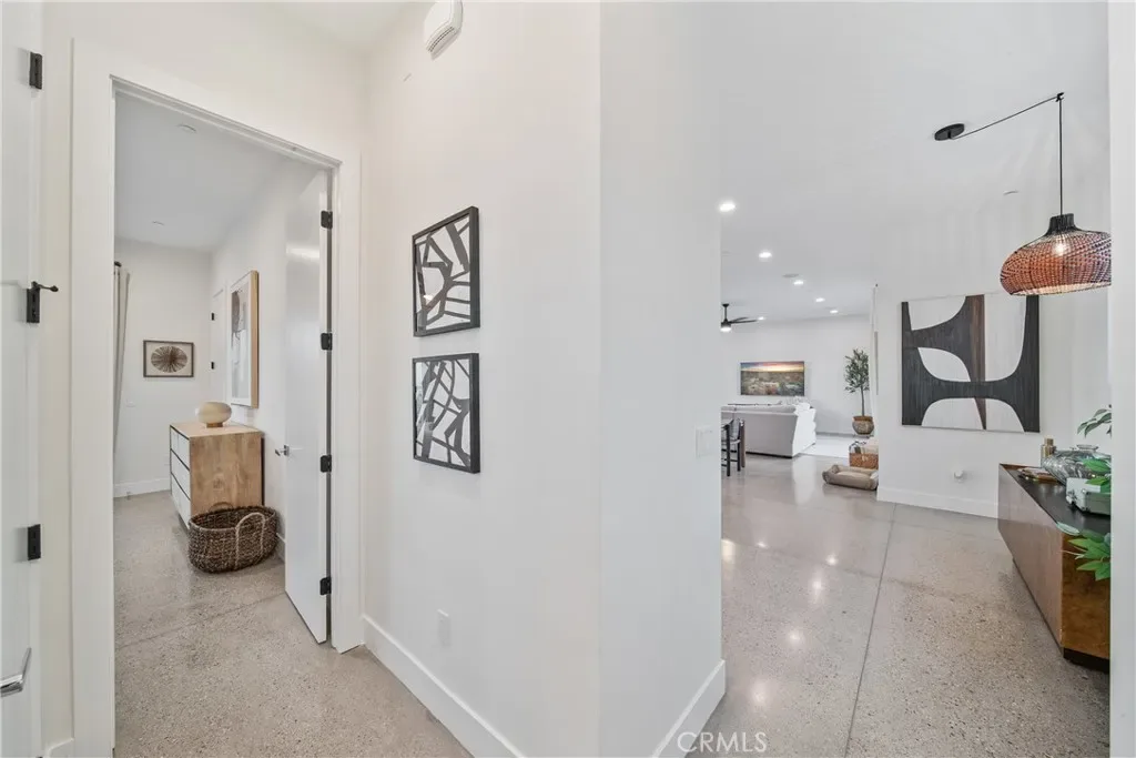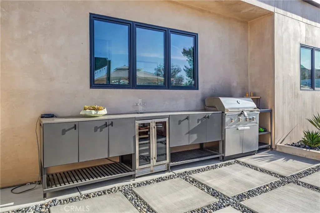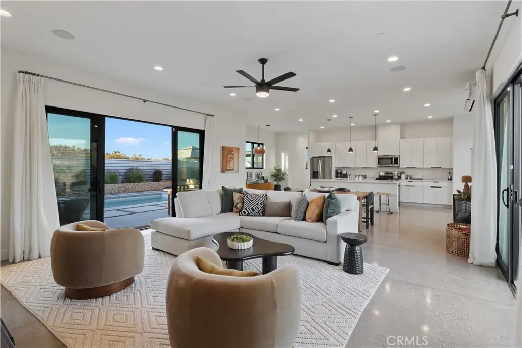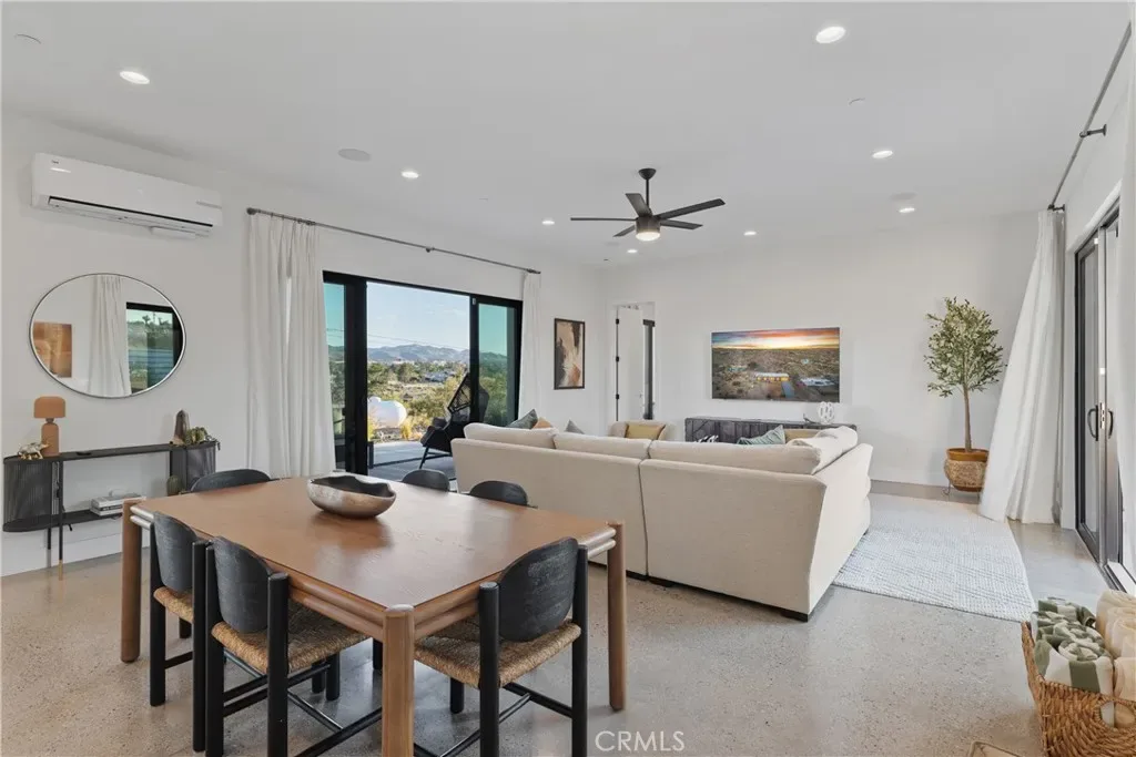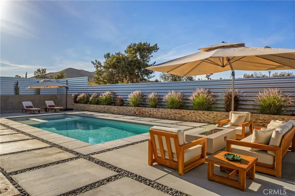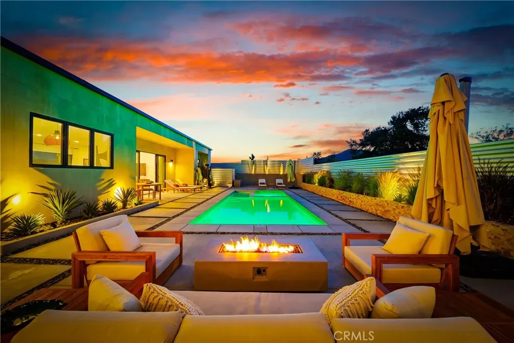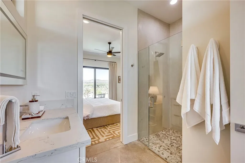 Experience elevated desert living in this newly constructed custom home, thoughtfully designed to capture the beauty and serenity of the Joshua Tree landscape. Positioned to take full advantage of sweeping valley views, the home offers a seamless connection between indoor comfort and outdoor tranquility through expansive windows and oversized sliding glass doors. The open-concept layout centers around a spacious great room, flanked by two generously sized bedrooms—each featuring its own ensuite bath—creating an ideal balance of privacy and flow. The kitchen is both functional and refined, complete with custom cabinetry, quartz countertops, stainless steel appliances, and a large island perfect for gathering and entertaining. Step outside to enjoy multiple living spaces designed for relaxation and entertaining, including a covered carport-style lounge area with built-in speakers and pre-wiring for a full entertainment setup. The private backyard retreat features a pool and spa, offering the perfect setting to unwind while taking in the desert’s unforgettable sunsets. Built with efficiency and modern living in mind, the home includes 2×6 construction with enhanced insulation, a high-efficiency zoned HVAC system, paid solar, EV charging, tankless water heater, and smart home pre-wiring throughout. A rare opportunity to own a modern desert retreat that blends thoughtful design, energy efficiency, and stunning natural surroundings.