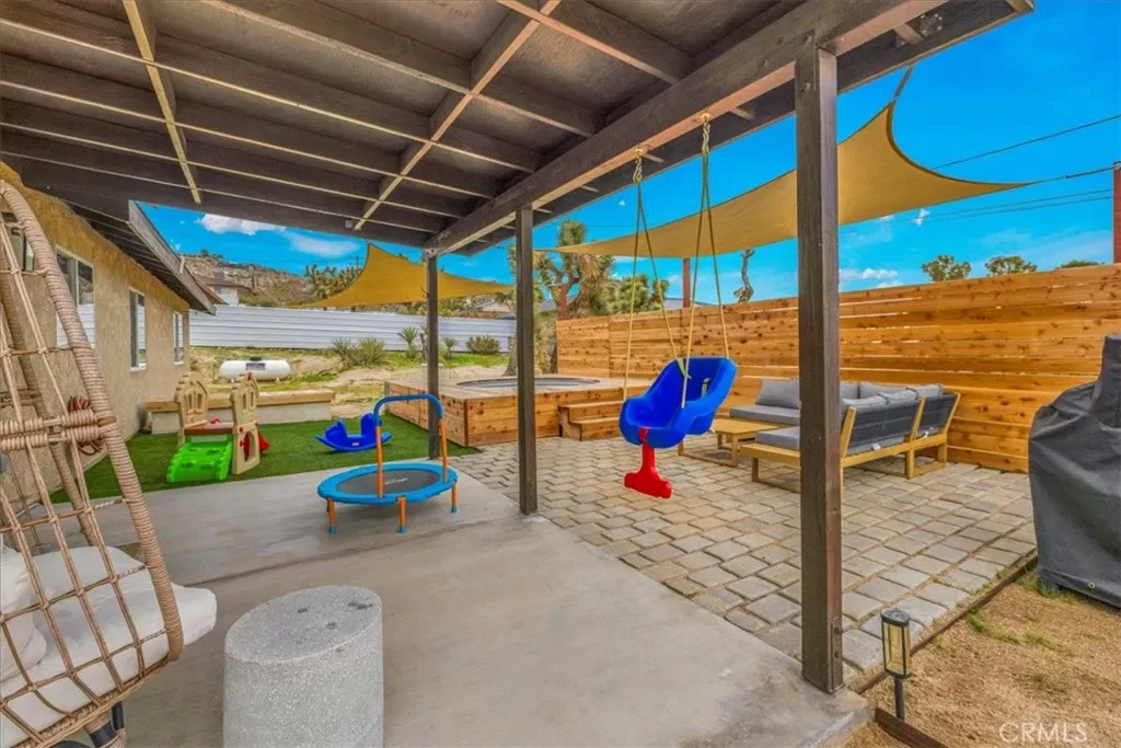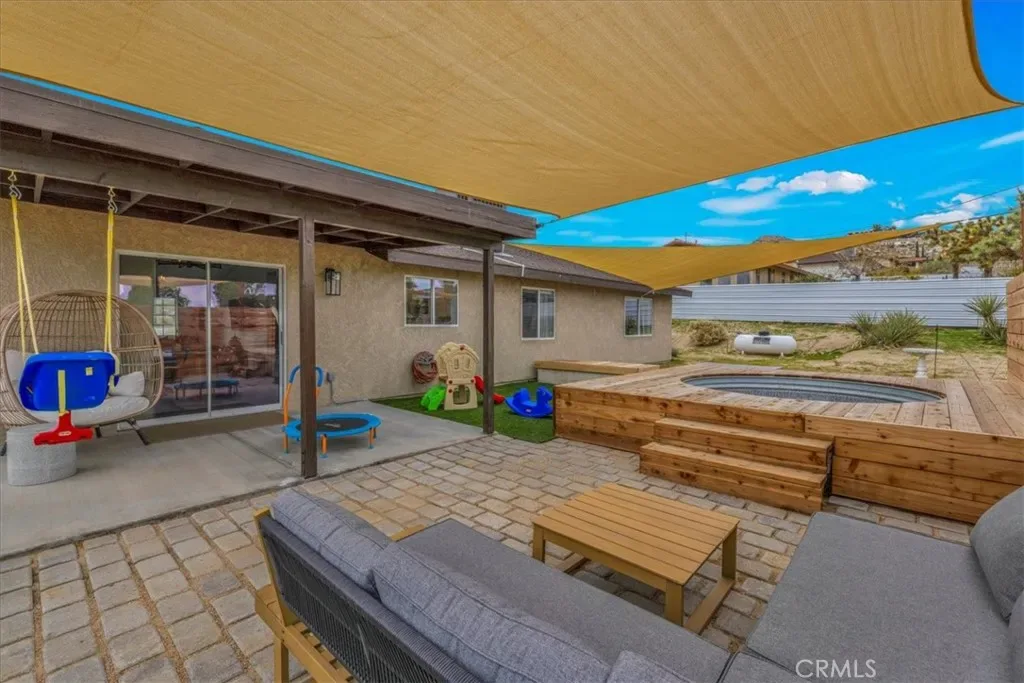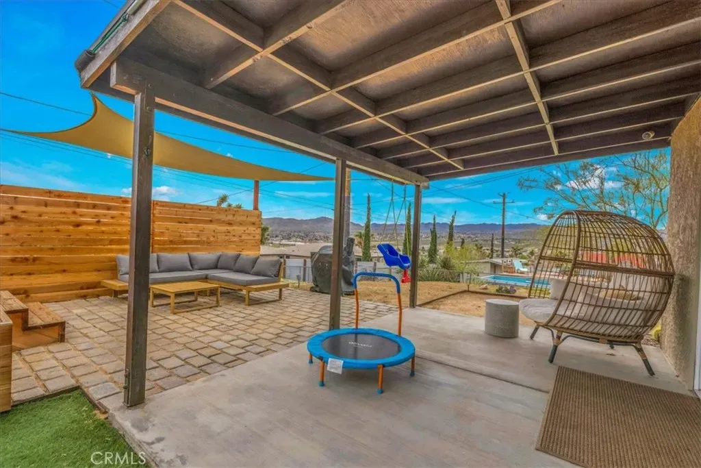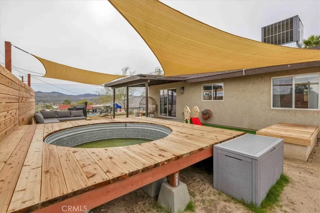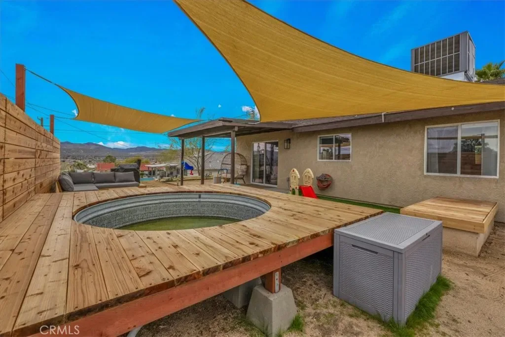 Outdoor living is a highlight, with a covered patio, shaded seating areas, and a filtered stock-tank style dunk pool/hot tub set against wide-open views across Yucca Valley and the surrounding hills. The backyard offers ample space to relax, gather, or further customize while enjoying expansive skies and sunsets.