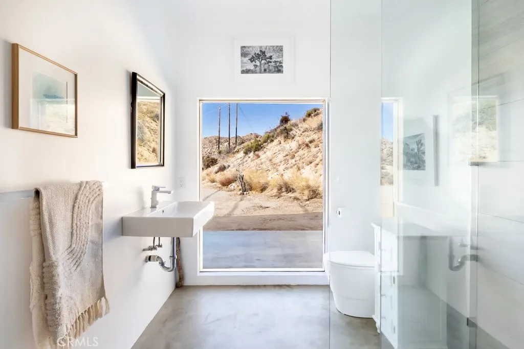 The guest bedroom and bath offer even more exquisite panoramic views of the majestic Sawtooth Mountains, above Pioneertown.