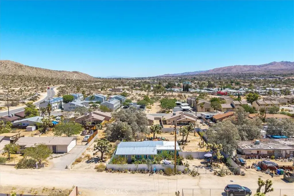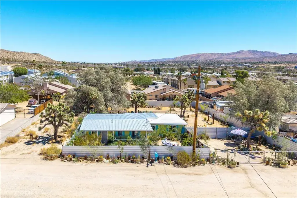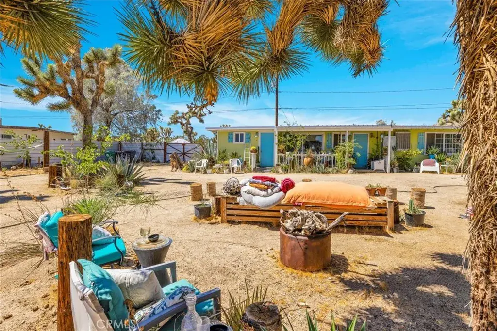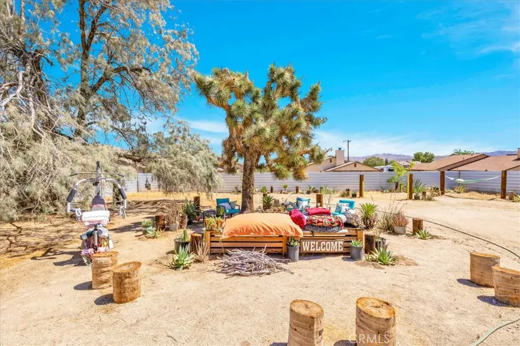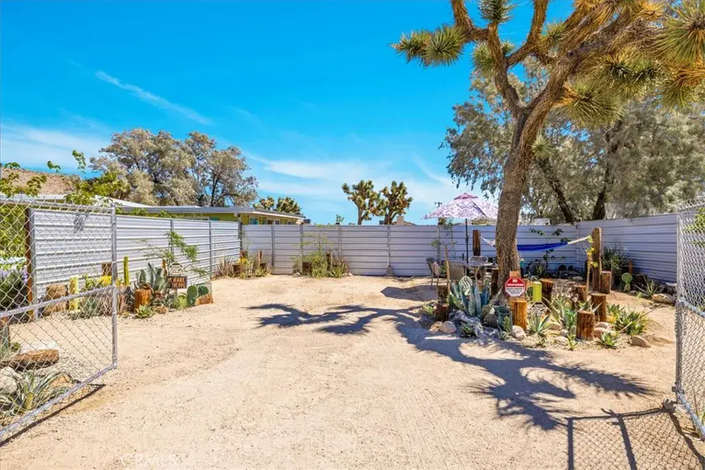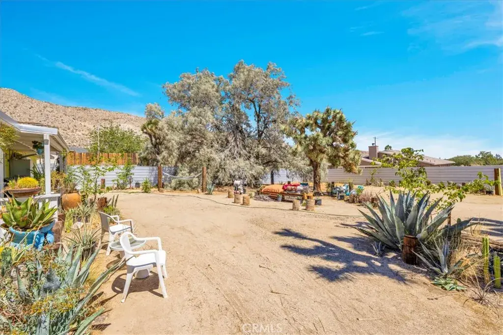 This charming 2 bedroom, 1 bath home on 1/3 acre in north downtown Yucca Valley combines comfort, style, and privacy with a convenient location. Beautiful landscaping and mountain views welcome you, along with a secure outdoor parking area and privacy fencing in both the front and backyard. Covered patios at the front and back of the home provide inviting spaces to relax outdoors in your own private oasis. Inside, the living room is spacious with high beamed ceilings, tile flooring throughout, and new windows that fill the space with light. The kitchen is nicely appointed and features an informal dining area with sliding glass doors to the backyard, plus a separate formal dining room for added flexibility. The bathroom is generously sized and includes a tub/shower combo. The first bedroom offers built-in storage and plenty of space, while the second bedroom is oversized with abundant natural light and large closet. A sizable bonus room provides even more versatility for work, hobbies, or guest use. Furniture is included, making this property move-in ready. With its thoughtful updates, spacious design, and excellent outdoor living features, this home is a wonderful opportunity in a desirable Yucca Valley neighborhood.