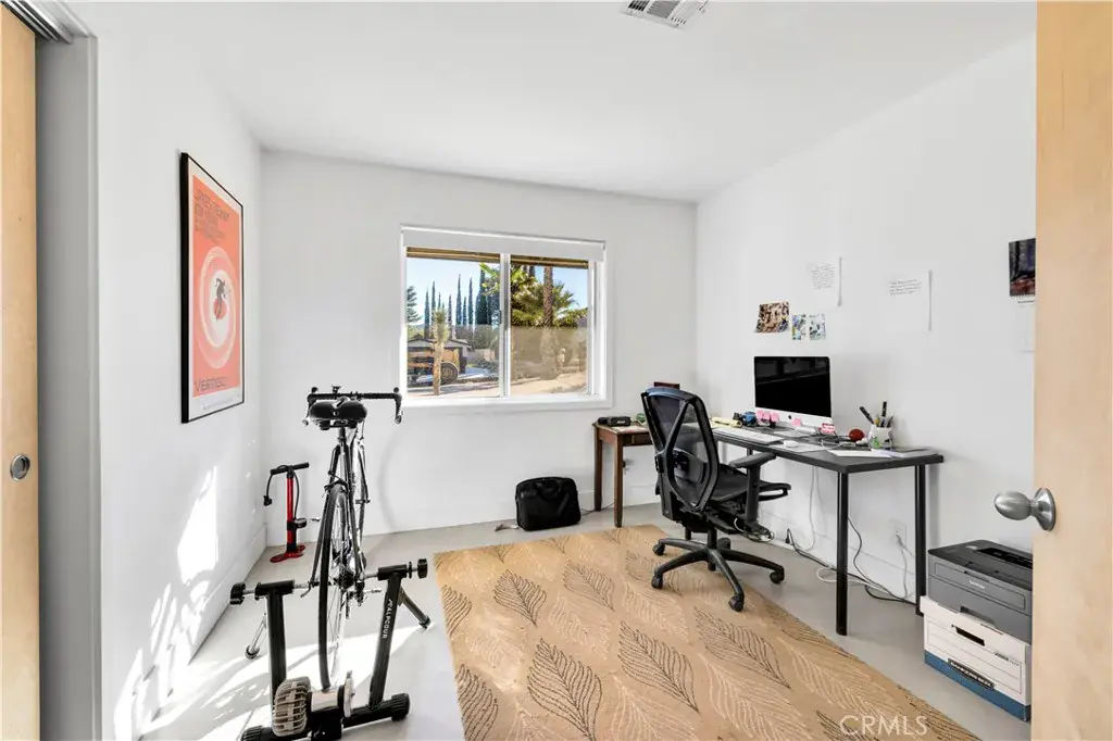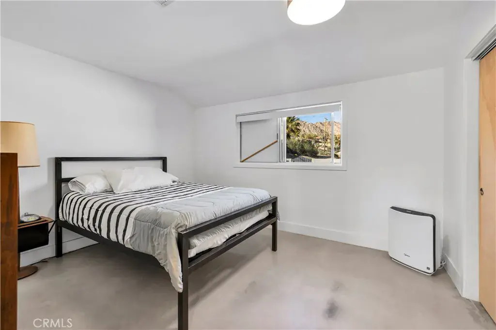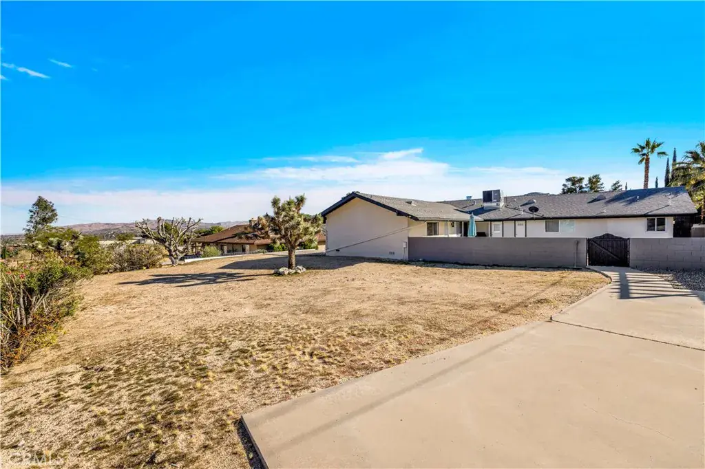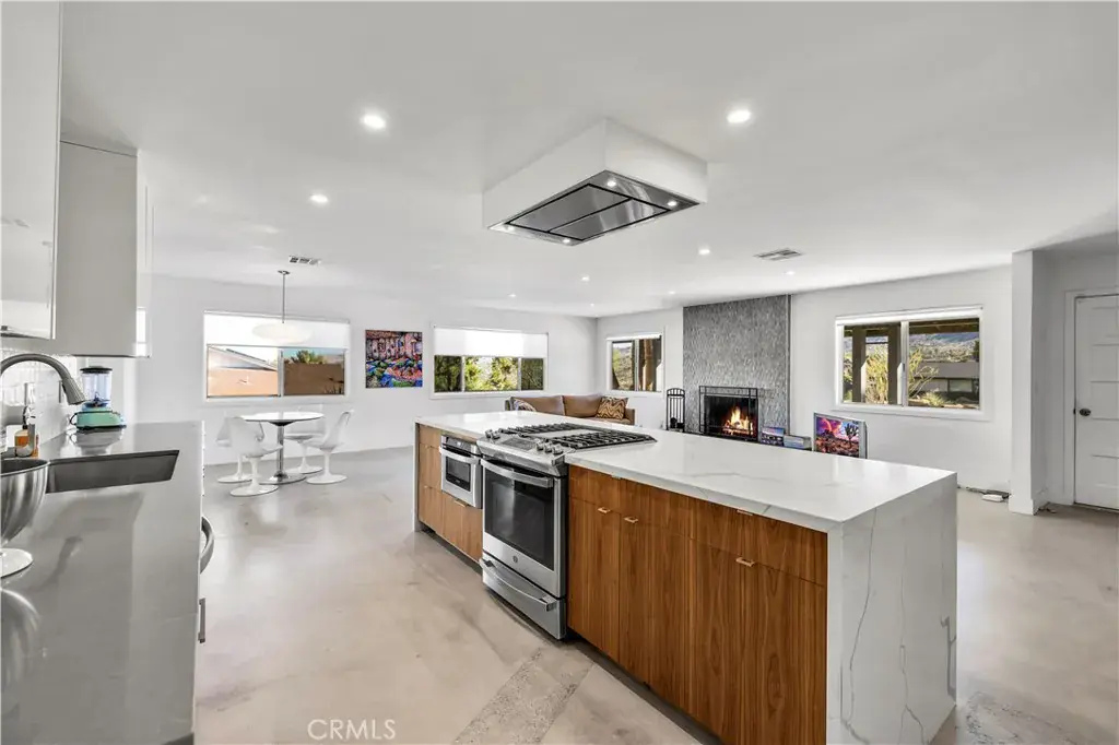 Your dream home awaits in this gorgeously appointed 3 bedroom, 2 bath home situated on just under 1/2 acre of land in the highly desirable Country Club area of Yucca Valley. As you approach the home, you’ll love that the neighborhood is tucked close to the majestic desert hills that frame the valley, and appreciate the attached 2 car garage. Sleek, ultra-modern finishes greet you as you enter the home, which has been tastefully updated throughout. The massive main living area enjoys large windows to let in plenty of natural light, an impressive 0 clearance fireplace, and stylish lighting. Polished concrete flooring flows throughout the space, adding to the clean styling of the home. The kitchen is beautifully appointed with quartz waterfall countertops, modern wood cabinetry and all new stainless steel appliances – including a gas range and second oven for the discerning chef. A spacious room off the main living space is perfect for a bonus room or formal dining area, and features high wood-beamed ceilings and two sliding glass doors to access the outdoor living space. Moving on, you’ll note the conveniently located laundry room with its own outside access as well. The guest bath continues the theme of modern style with a floating vanity and glass-doored walk-in shower, and each guest bedroom is airy and well let with plenty of closet space. The primary bedroom is huge with large windows and an attached bath with another floating vanity with full tile backsplash, large walk-in glass shower, and closet. Book a showing to experience this beautiful desert sanctuary for yourself.