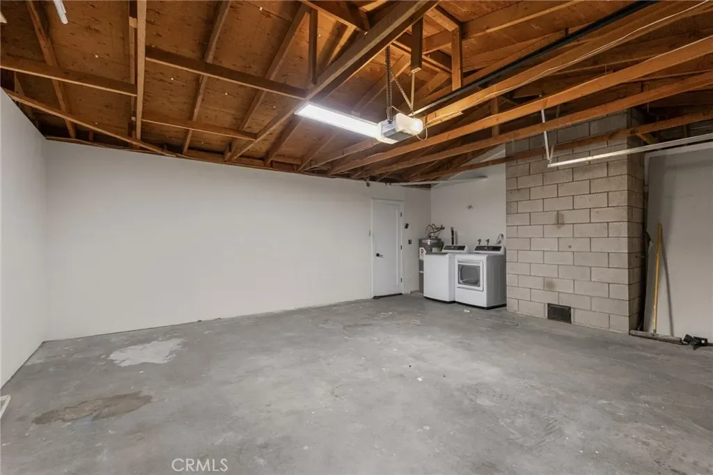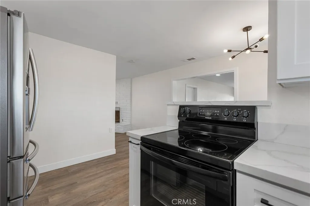 The kitchen is both stylish and functional with a U shaped layout, featuring white shaker cabinetry, quartz countertops, and an electric range. Just off the kitchen, the dining area is cozy yet practical, offering the perfect space for everyday meals or intimate gatherings. Both bedrooms are comfortably sized with ample closet space and great natural light. The bathroom stands out with eye catching geometric tile flooring, a shower and tub combination, and classic white subway tile surround. Laundry is conveniently located in the attached garage.