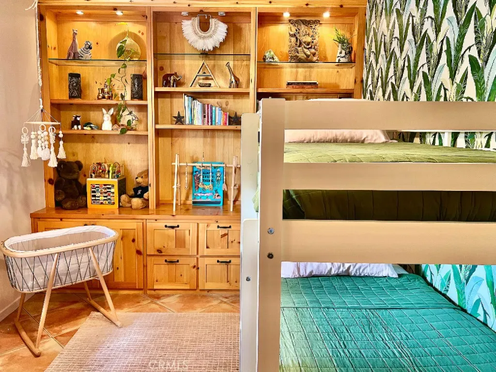 The home offers large, comfortable bedrooms, including a well-appointed primary suite with jacuzzi tub, walk-in shower, double vanity, and walk-in closet. A fourth bedroom—currently staged as additional sleeping space for vacation rental guests—was previously used as a beautiful office/library with wood paneling and built-in bookshelves.