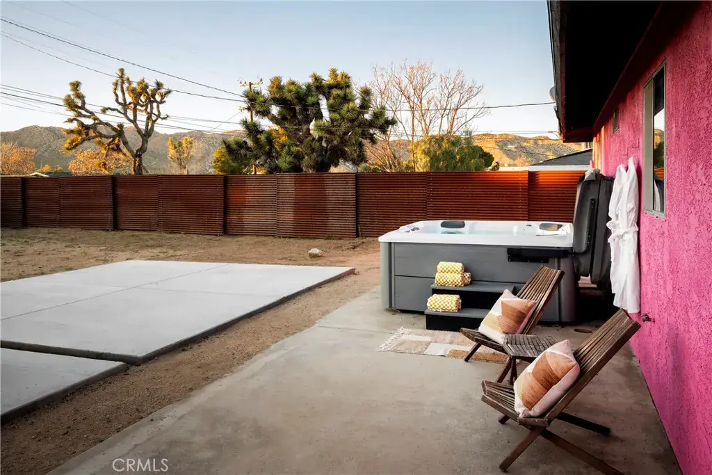 The fully fenced backyard offers privacy and mountain views in every direction. In addition to the large spa, the outdoor space includes concrete seating and entertaining areas, perfect for gathering and enjoying the desert lifestyle under the stars.