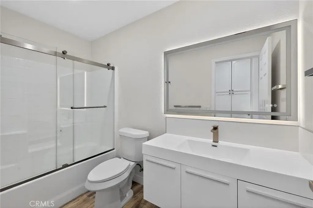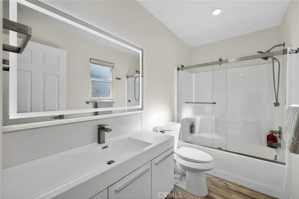 The breathtaking new kitchen showcases glossy finish cabinetry, quartz countertops with a waterfall edge, stainless steel appliances (all included), and modern fixtures. Both bathrooms have been newly remodeled with elegant vanities and LED mirrors.