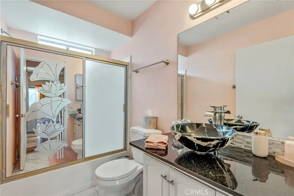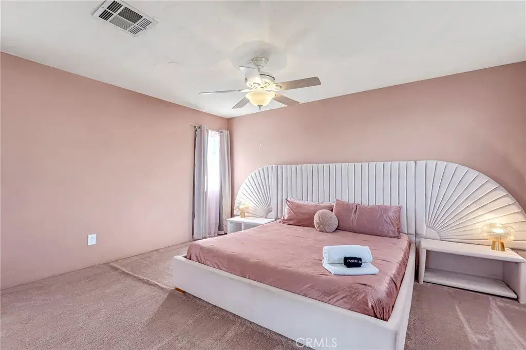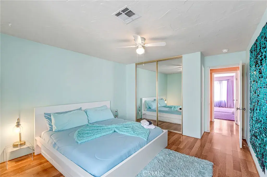 The three bedrooms feature playful patterns, vibrant colors, and plush furnishings, while the spacious primary suite includes an ensuite bathroom with shower. An updated kitchen showcases high-end stainless steel appliances, custom lighting, and built-ins, opening seamlessly to a highly functional floor plan ideal for entertaining, hosting dinners, or relaxing evenings with friends.
