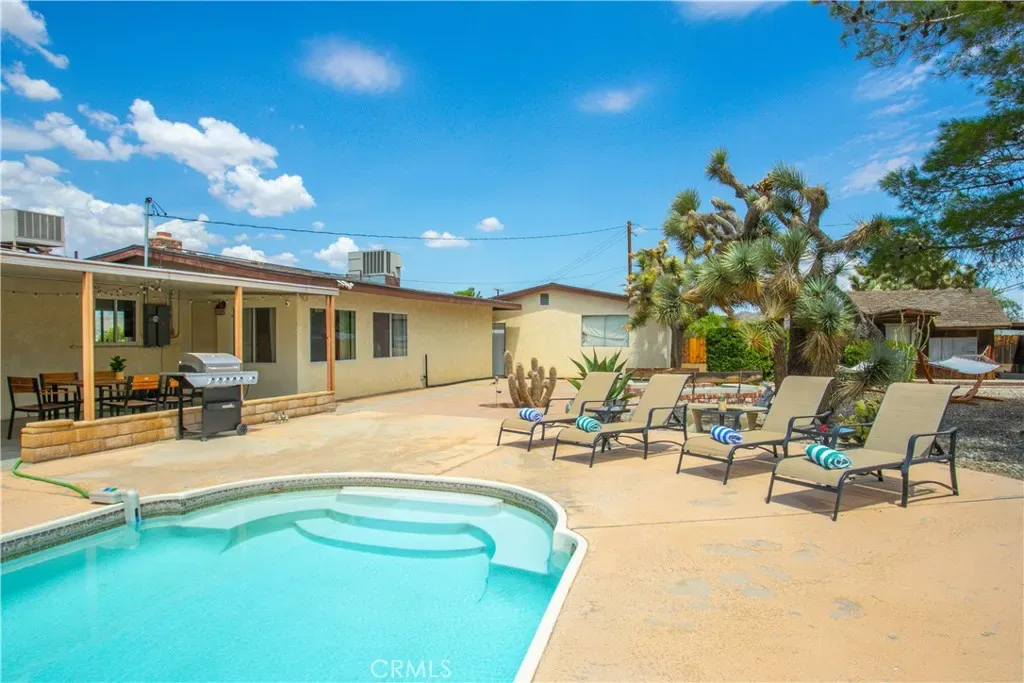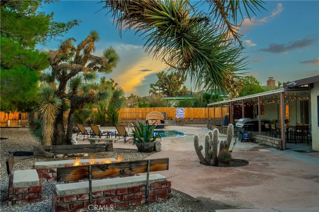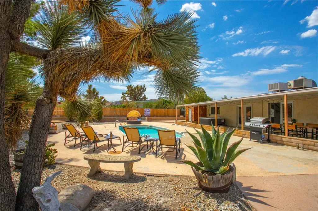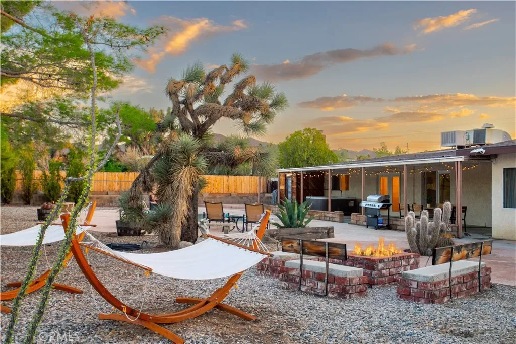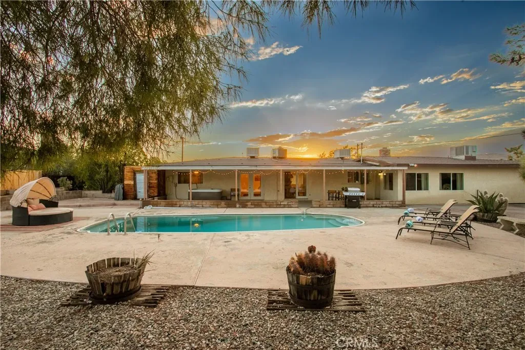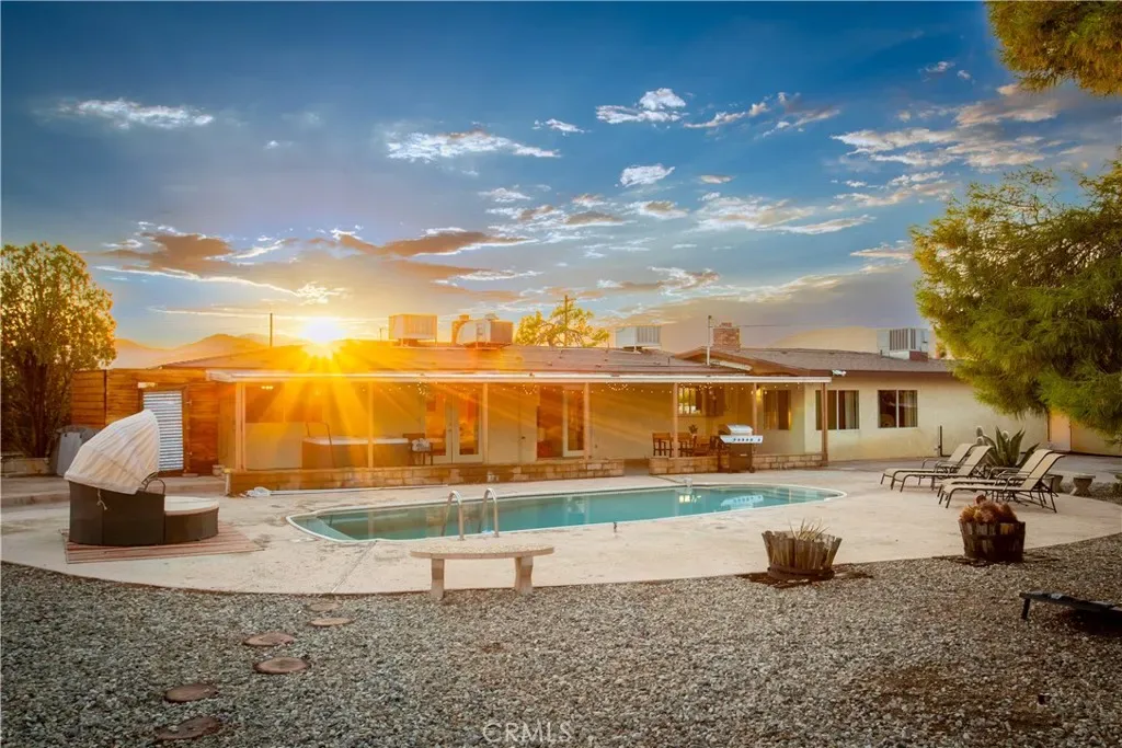 Welcome to 7737 Aster Ave, a stunning POOL home and successful Airbnb (FULLY FURNISHED / RENOVATED IN 2022) located in the heart of Yucca Valley. Nicely set on .62 acres of land, this gorgeous 4 bedroom, 3 bath desert home has been beautifully upgraded with everything intentionally chosen to bring you the perfect desert home, airbnb or weekend retreat. Upon arrival, you’re greeted with a large, semi-circle driveway and manicured yard, showcasing pride of ownership from the moment you pull in. As you step inside the 2,375 square foot home you’ll instantly notice the stunning floor-to-ceiling stone fireplace, warm wood-like flooring and large windows that let in an abundance of natural light. The second living room/den (currently set up as a game room) adorns beautiful exposed beams and a charming brick-faced fireplace for added ambiance. The kitchen is complete with ample cabinet space, mosaic tile backsplash, granite counter tops and stainless steel appliances. There is also a formal dining room just off the kitchen which open to the backyard, perfect for seamless indoor-outdoor entertaining. The primary bedroom features crown molding, two closets and a private full bathroom with a single-sink vanity and a walk-in shower. The second ensuite bedroom features sliding glass doors to the back yard, dual closets and a bathroom with a pedestal sink and tiled walk-in shower. The third bedroom also opens to the backyard through French doors and the third and most opulent bathroom adorns a timeless clawfoot bathtub, crown molding, tasteful gold accents and a custom antique-style vanity. That’s just the inside; the backyard is an entertainer’s paradise. From the oversized covered patio to the large in-ground pool, fire pit with seating, relaxing spa & hammocks, mature landscaping and ample space for hosting, it’s like having a mini resort right outside your back door. This home is complete with dual cooling (AC & Evaporative Cooling), an indoor laundry room, detached 2 car garage, pool room and dog run or horse shoe area. Last but not least, take in the gorgeous views of the snowcap mountains and the breathtaking cotton candy sunsets right from your front porch. It’s just a short 11 minute drive to Joshua Tree or a quick 35 min drive to Palm Springs so you’re close to all the wonderful attractions our desert has to offer. Schedule a showing today & let this home’s charming allure do the rest. Your new desert home or weekend retreat awaits!