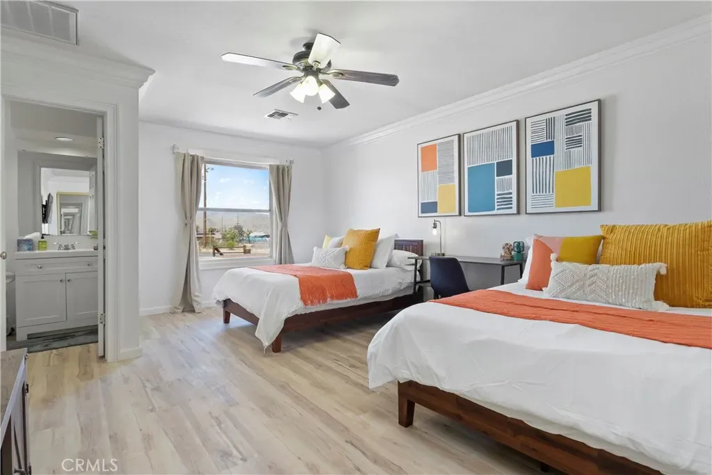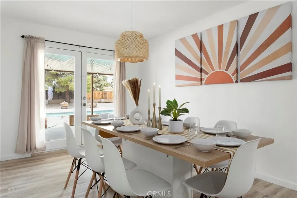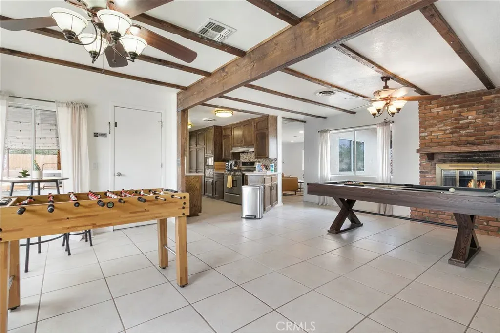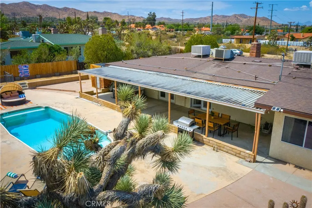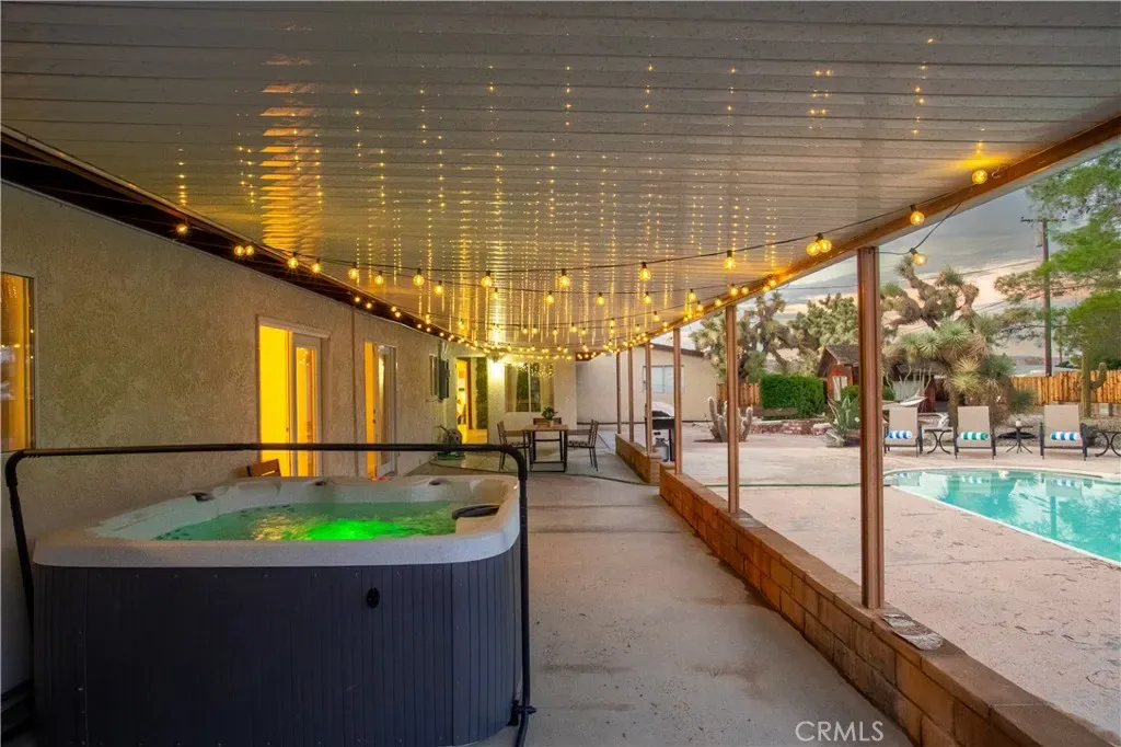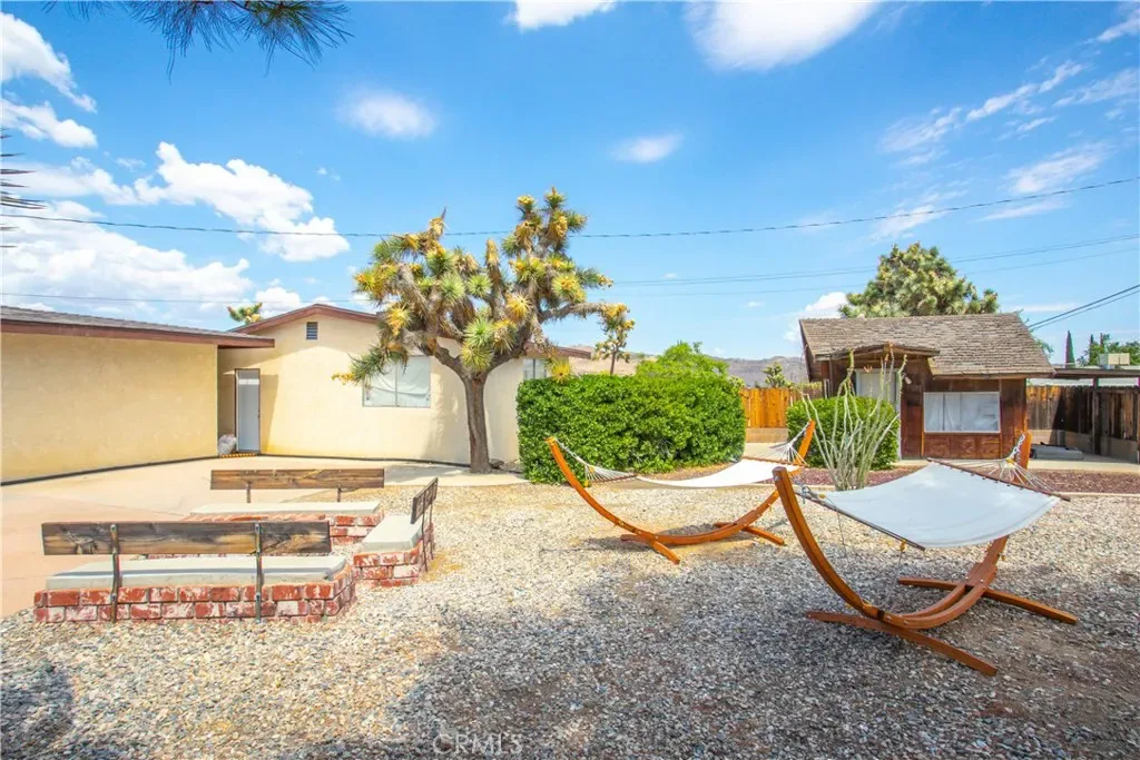 Welcome to 7737 Aster Ave, a stunning POOL home and successful Airbnb (FULLY FURNISHED / RENOVATED IN 2022) located in the heart of Yucca Valley. Nicely set on .62 acres of land, this gorgeous 4 bedroom, 3 bath desert home has been beautifully upgraded with everything intentionally chosen to bring you the perfect desert home, airbnb or weekend retreat. Upon arrival, you’re greeted with a large, semi-circle driveway and manicured yard, showcasing pride of ownership from the moment you pull in. As you step inside the 2,375 square foot home you’ll instantly notice the stunning floor-to-ceiling stone fireplace, warm wood-like flooring and large windows that let in an abundance of natural light. The second living room/den (currently set up as a game room) adorns beautiful exposed beams and a charming brick-faced fireplace for added ambiance. The kitchen is complete with ample cabinet space, mosaic tile backsplash, granite counter tops and stainless steel appliances. There is also a formal dining room just off the kitchen which open to the backyard, perfect for seamless indoor-outdoor entertaining. The primary bedroom features crown molding, two closets and a private full bathroom with a single-sink vanity and a walk-in shower. The second ensuite bedroom features sliding glass doors to the back yard, dual closets and a bathroom with a pedestal sink and tiled walk-in shower. The third bedroom also opens to the backyard through French doors and the third and most opulent bathroom adorns a timeless clawfoot bathtub, crown molding, tasteful gold accents and a custom antique-style vanity. That’s just the inside; the backyard is an entertainer’s paradise. From the oversized covered patio to the large in-ground pool, fire pit with seating, relaxing spa & hammocks, mature landscaping and ample space for hosting, it’s like having a mini resort right outside your back door. This home is complete with dual cooling (AC & Evaporative Cooling), an indoor laundry room, detached 2 car garage, pool room and dog run or horse shoe area. Last but not least, take in the gorgeous views of the snowcap mountains and the breathtaking cotton candy sunsets right from your front porch. It’s just a short 11 minute drive to Joshua Tree or a quick 35 min drive to Palm Springs so you’re close to all the wonderful attractions our desert has to offer. Schedule a showing today & let this home’s charming allure do the rest. Your new desert home or weekend retreat awaits!
