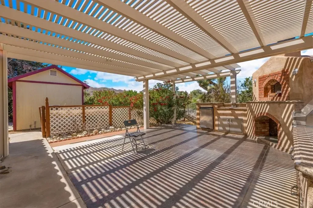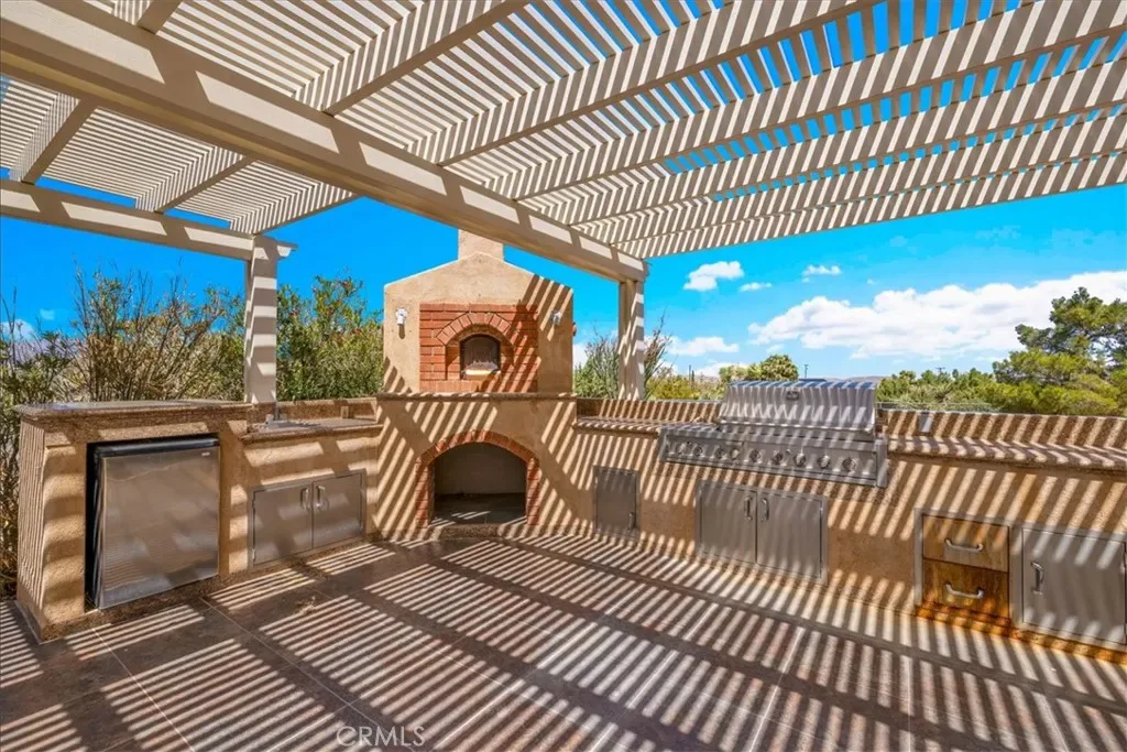 Outdoor living is a standout feature here. The backyard includes a large covered patio, enclosed sunroom, and a custom outdoor kitchen area with built-in BBQ and pizza oven—ideal for enjoying desert evenings. Raised garden beds, mature landscaping, and multiple seating areas create a functional and inviting outdoor space. VIEWS in every direction capture the surrounding mountains and open desert skies.