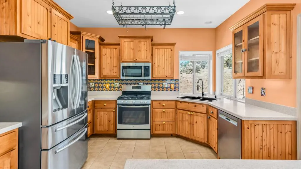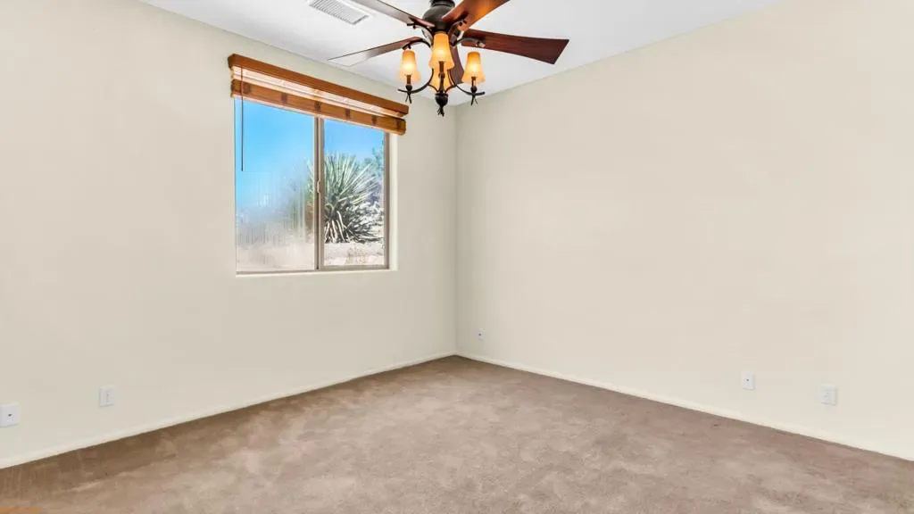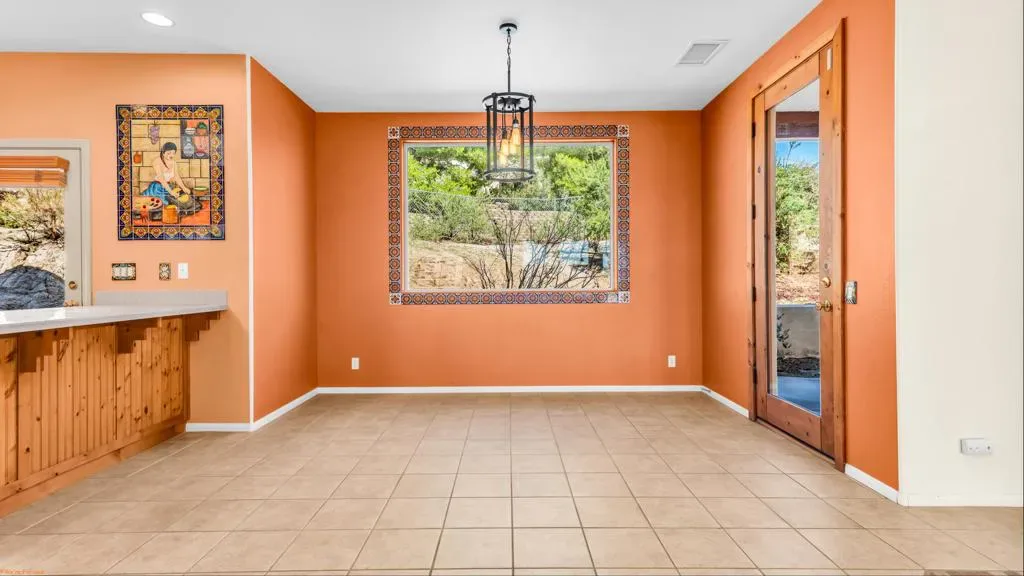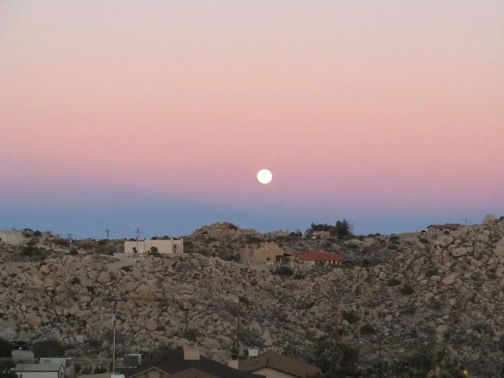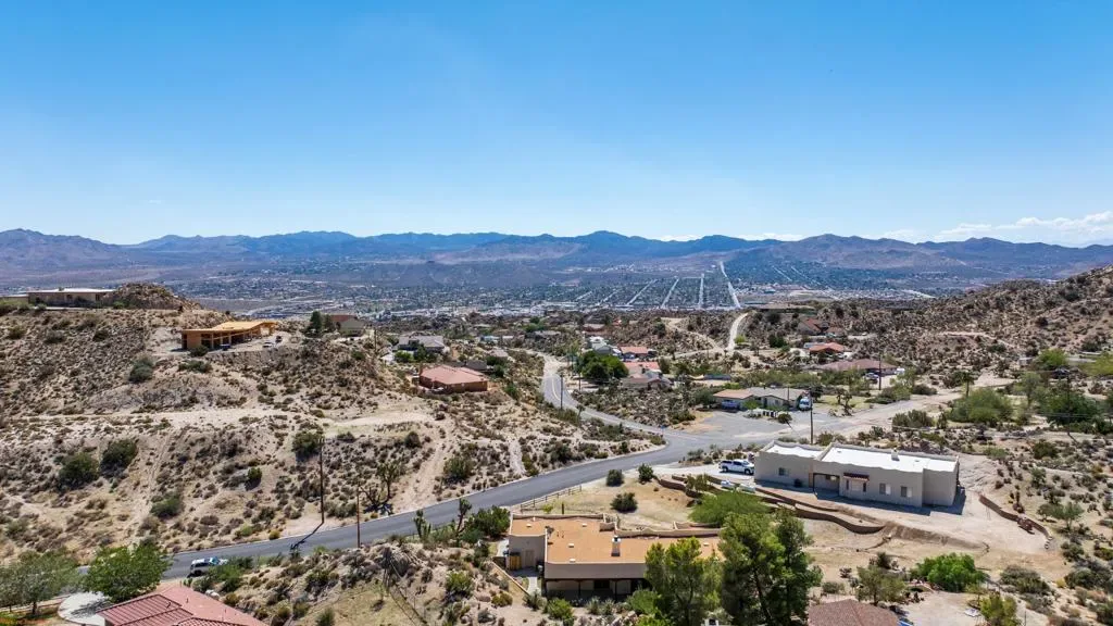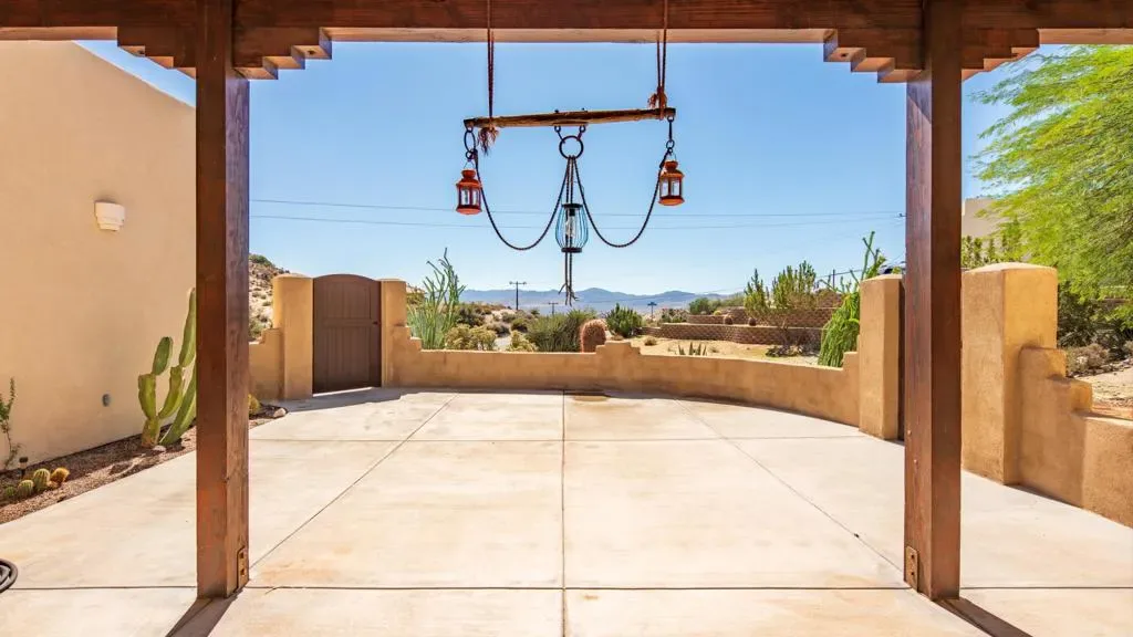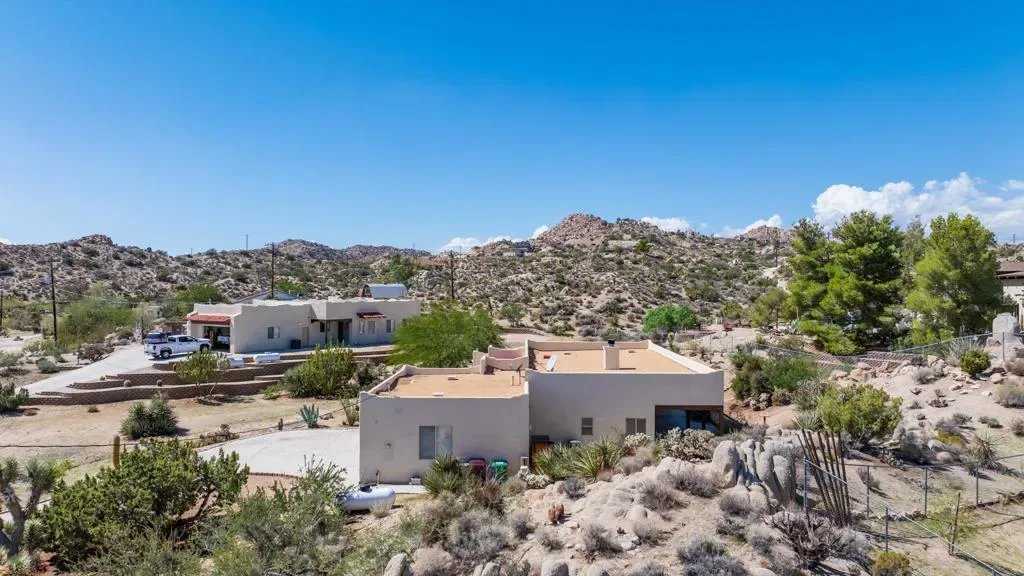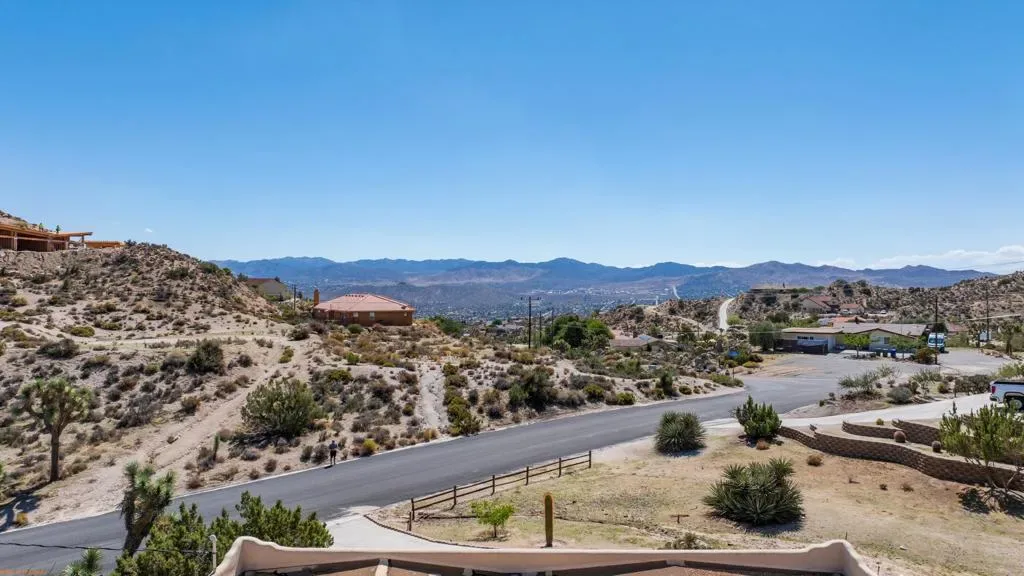 Experience elevated Yucca Valley living in this Sante Fe style home with panoramic mountain and desert vistas from every window, and two outdoor patios for indoor outdoor living. This 3 bed, 2 bath home exudes the distinctive flair of the southwest with wood beam ceilings, gorgeous unique woodcrafted cabinetry, Talavera tiles as backsplash, light plates, window accent, artwork, and cabinet knobs. Open concept living room and dining area are centered with a striking fireplace, and stunning views that captivate your eyes. The kitchen is spacious and ready for the busy cook with SS appliances, trendy black sink and faucet, under cabinet lighting, and a door to the back patio for easy outdoor BBQ and dining. There is a breakfast bar to seat 3 comfortably, a workspace, and glass front cabinets. The primary bedrm is set apart for privacy, slider to the back patio, large walk-in closet, large ensuite bath, separate shower, double sinks. Two guest bedrms are roomy, carpeted, and one has a walk-in closet, share the nearby convenient guest bath. The front courtyard beckons you at night to take in the city lights below from your hillside perch. The back courtyard is covered and roomy perfect for dining out or taking quiet moments from a lounge chair. Close to shopping, dining, and attractions like Joshua Tree National Park. Retirees downsizing will find comfort in the single-story design and SW charm. Creative professionals, entrepreneurs, locals will enjoy the inspiring views and space to create–indoors and out. Remote workers can escape the city and work from a serene, stylish environment. Second-home buyers will find an easy lock-and-leave home less than two hours from Los Angeles. Original architectural details offer a classic desert aesthetic, while the spacious lot invites endless possibilities–whether it’s a garden, workshop, studio, or outdoor lounge. Soak in the serenity with morning coffee on the patio or wind down as the sun sets over the hills. This is the home you’ve been searching for. Photos with furniture are digitally staged.