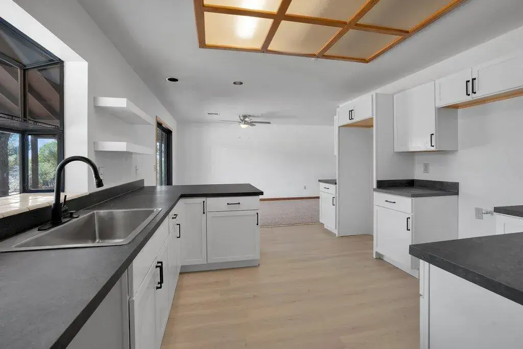 This three bedroom, two bath ranch-style home in popular Sky Harbor has over 1800 sq. ft. of living space. From the circular driveway, enter the formal entry to the Living room with dining area straight ahead and the new kitchen to the left. There is a separate laundry room with pantry between the kitchen and two-car garage with work and storage areas. Storage cabinets line the hallway leading to two bedrooms on the front side of the home and a full bathroom at the end of the hallway. A hallway closet and the primary bedroom and bath are located on the backside of the home. Sellers installed a new kitchen with new vinyl flooring this year and added new carpet in living, dining and hallway areas. new toilets in the bathrooms and new paint inside throughout. The home sits on a large, corner lot that is fenced-in. A roof was added in June 2021, The home was a successful family rental property for many years and is ready for a new owner or investor’s tenant. Sellers are happy to work with lenders, including FHA and VA. This home enters the market after a lengthy probate and the real estate agent is related to the sellers. The home is unfurnished. Some pictures are digitally staged.